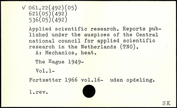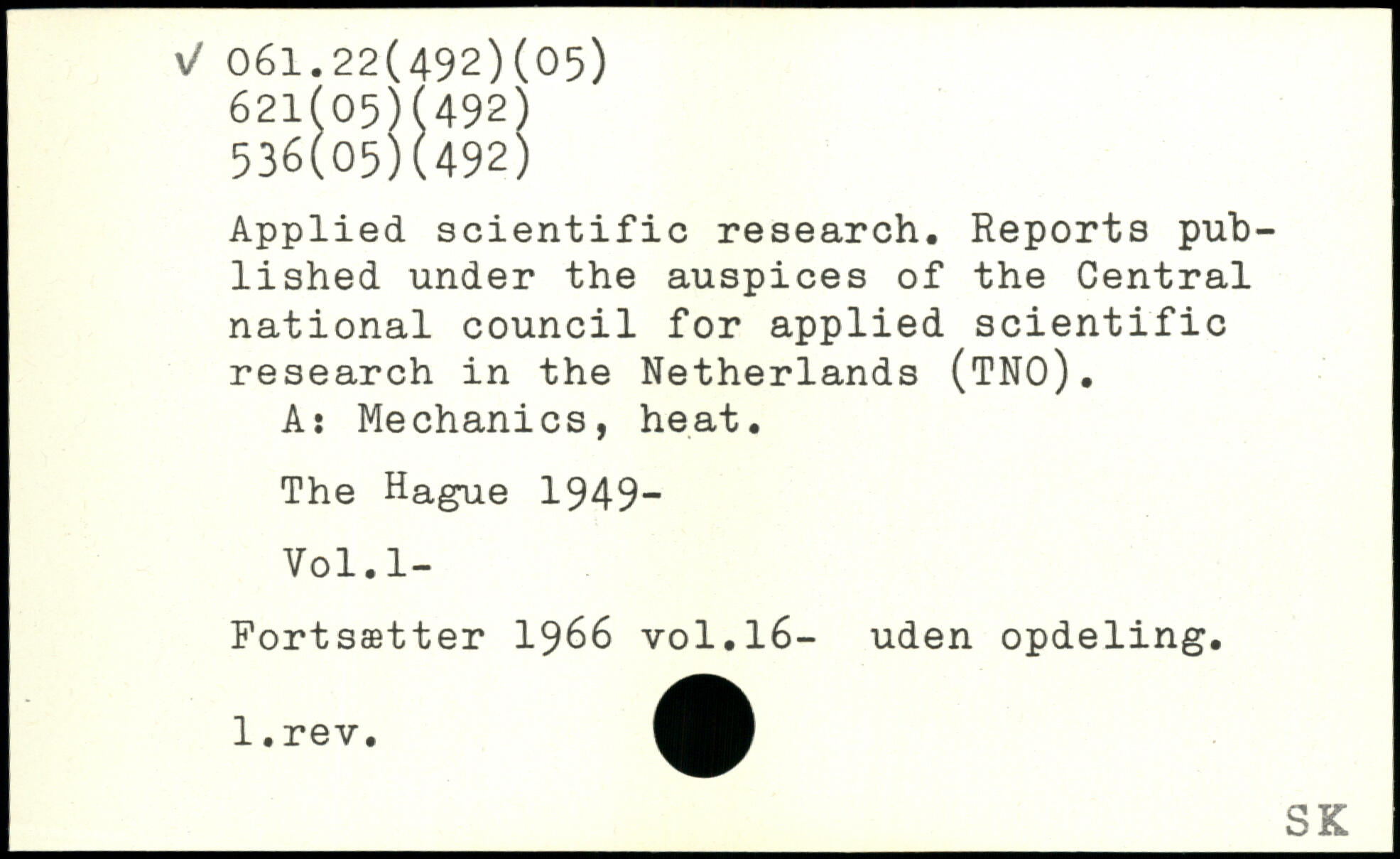 Applied scientific research. Reports published under the auspices of the Central national council for applied scientific research in the Netherlands (TNO). A: Mechanics, heat.