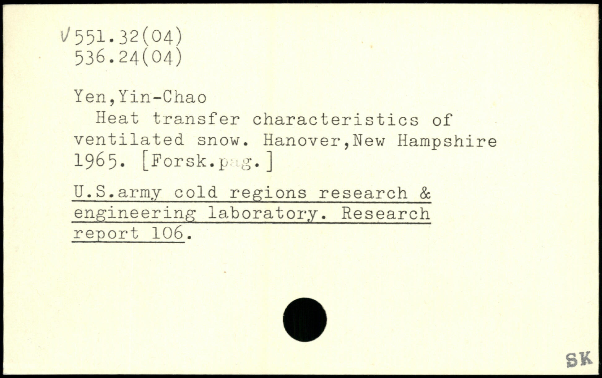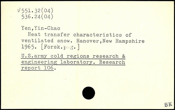 Heat transfer characteristics of ventilated, snow. Hanover,Hew Hampshire 1965. [Forsk.p g.] U.S.army cold regions research & engineering laboratory. Research report 106.