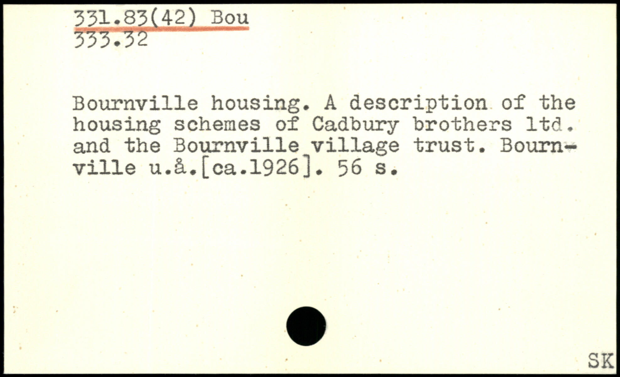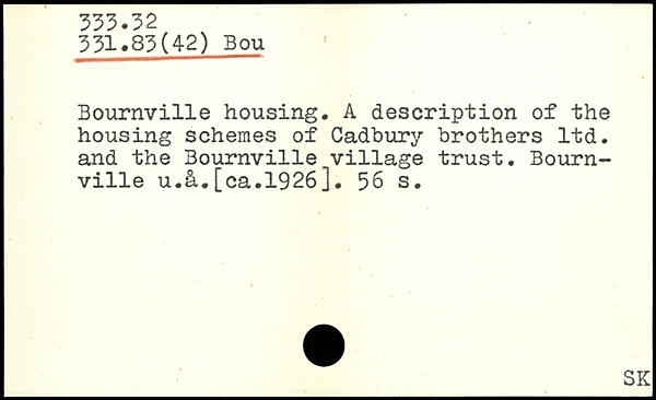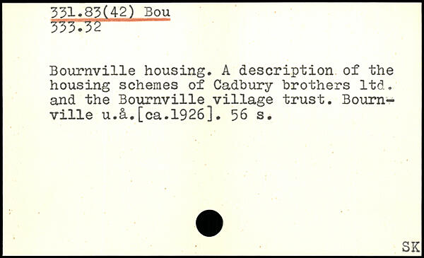 Bournville housing. A description of the housing schemes of Cadbury brothers ltd♦ and the Bournville village trust. Bournville u.â.[ca.1926].