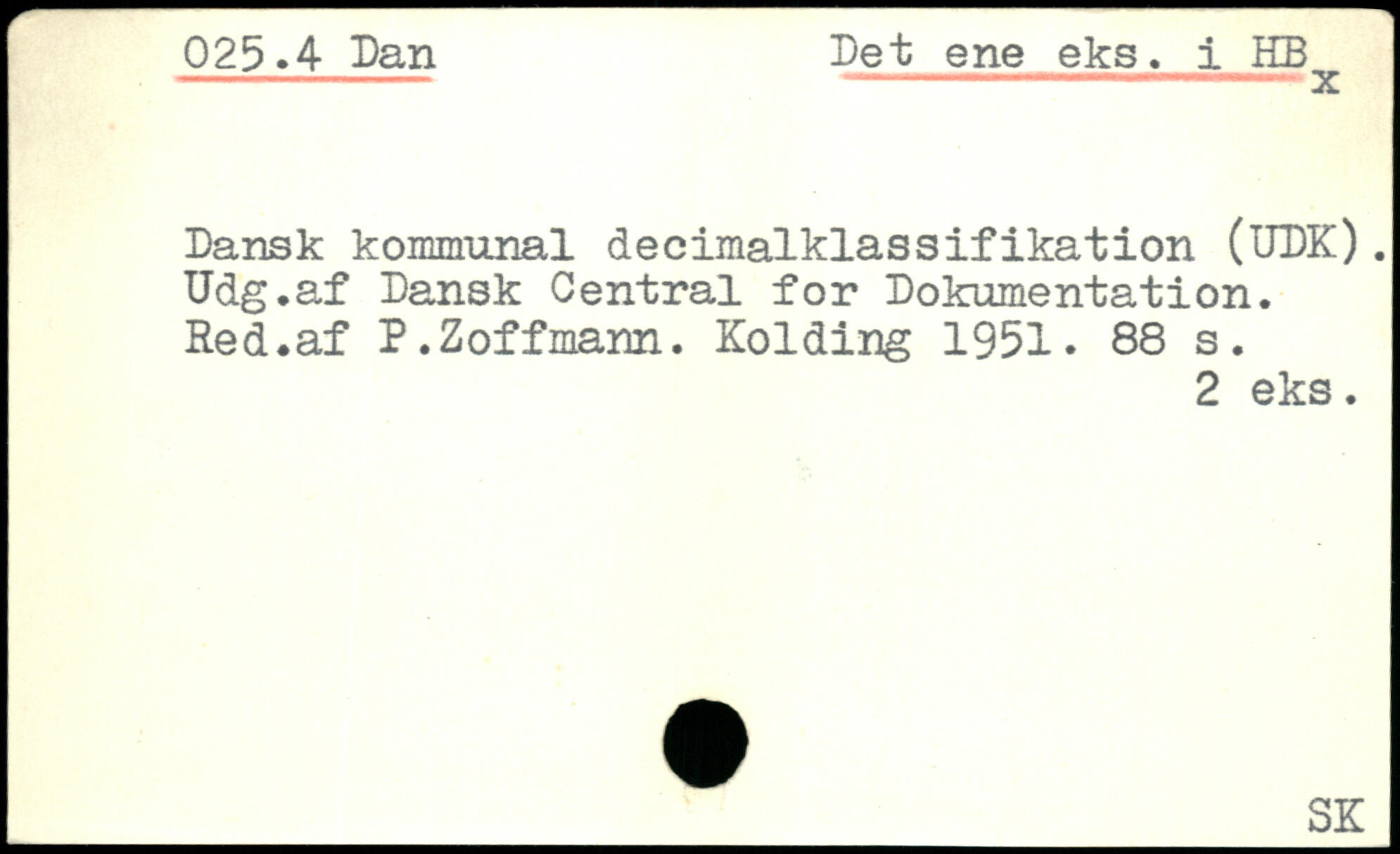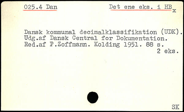 Dansk kommunal decimalklassifikation (UDK). Udg.af Dansk Central for Dokumentation. Red.af P.Zoffmann. Kolding 1951.