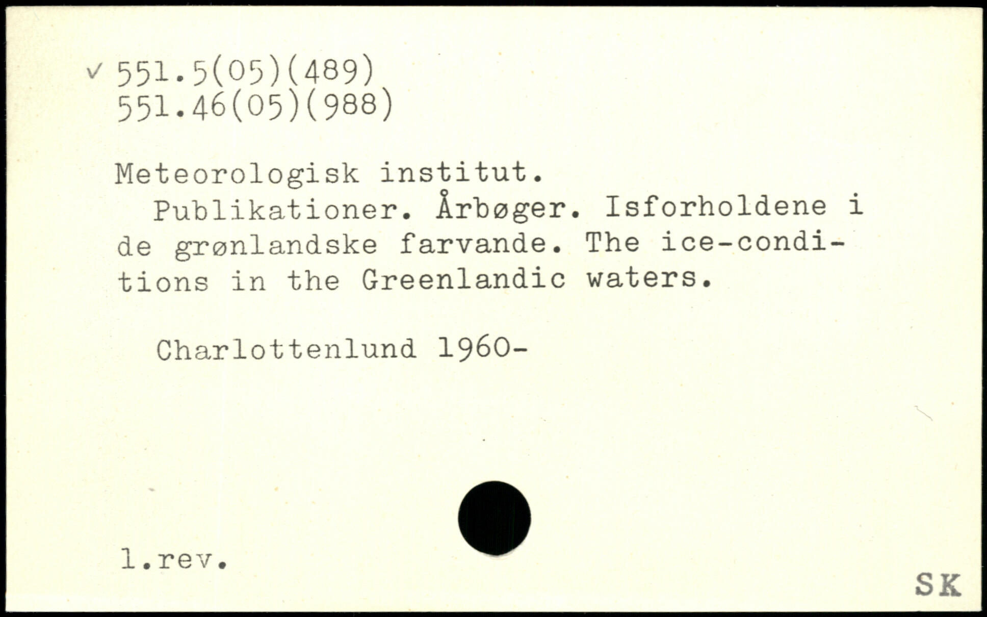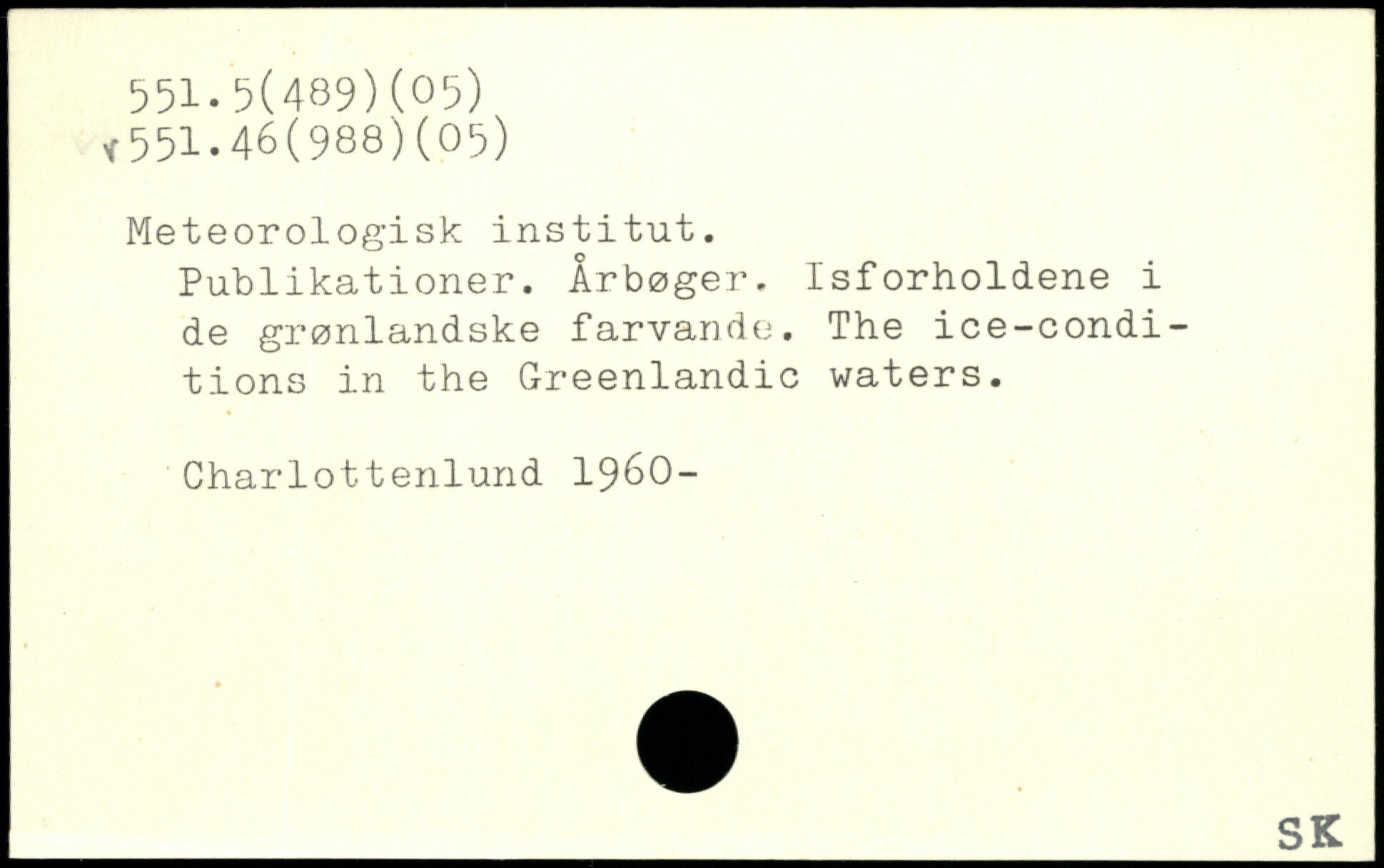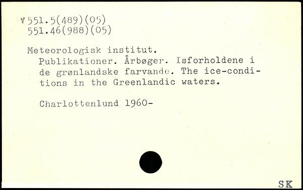 Meteorologisk institut. Publikationer. Årbøger. Isforholdene i de grønlandske farvande. The ice-condi-tions in the Greenlandic waters. Charlottenlund 1960- 1-r6V-_SK