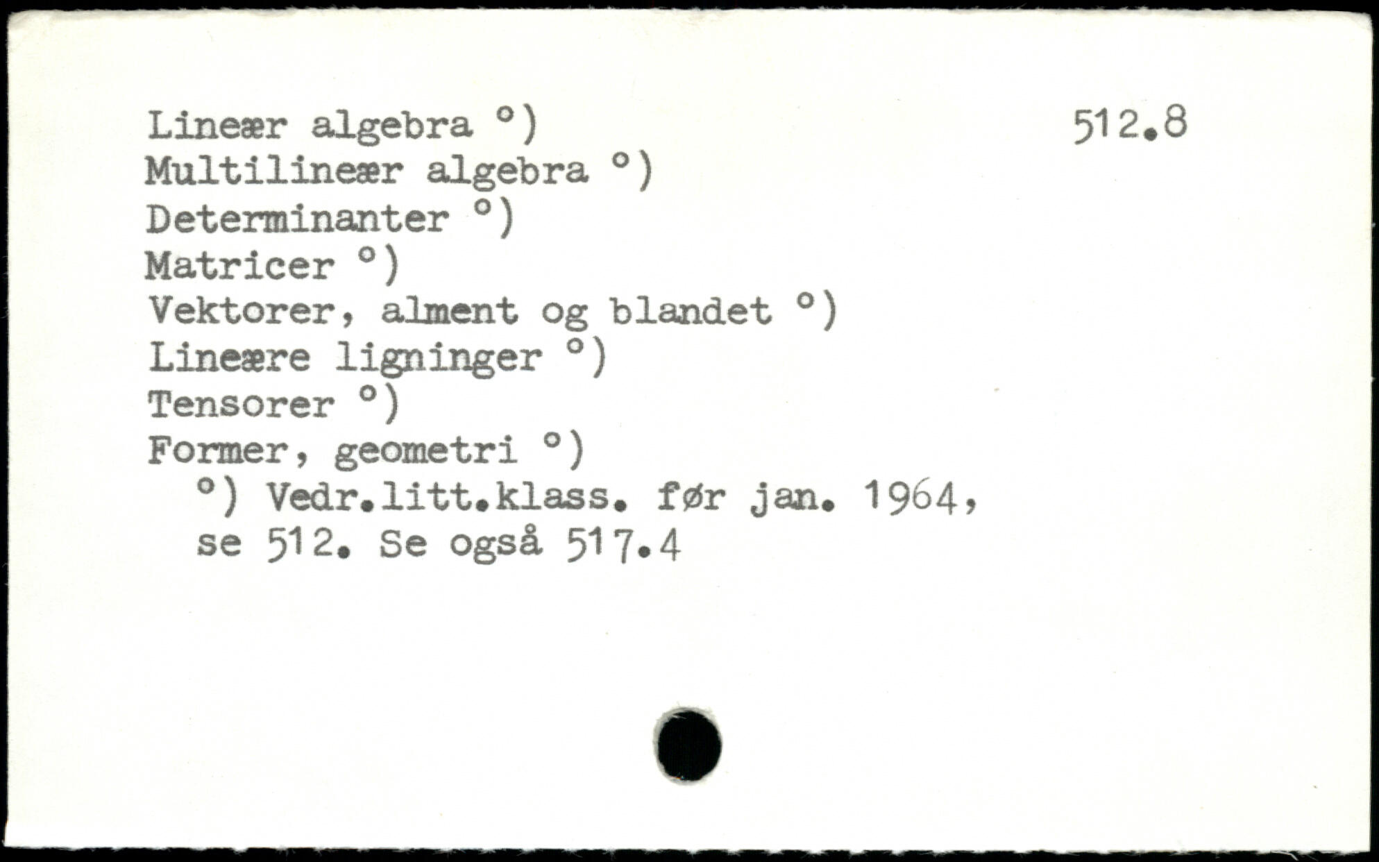 Lineær algebra .) 512.8 Multilineær algebra .) Determinanter .) Matricer .) Vektorer, alment og blandet .) Lineære ligninger .) Tensorer .) Former, geometri .) .) Vedr.litt.klass. før jan. 1964? se 512. Se også 517.4
