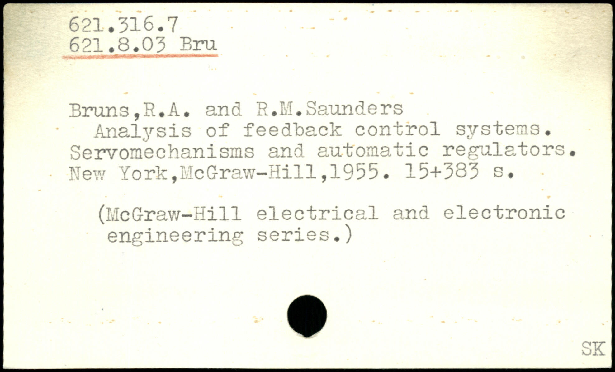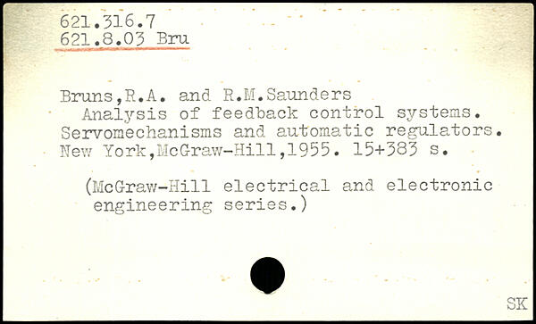 Bruns,R.A, and R.M.Saunders Analysis of feedback control systems. Servomechanisms and automatic regulators.