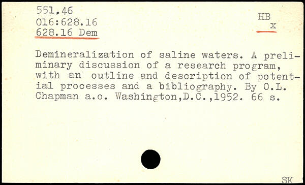Demineralization of saline waters. A preliminary discussion of a research program, with an outline and description of potential processes and a bibliography. By O.L. Chapman a.o.