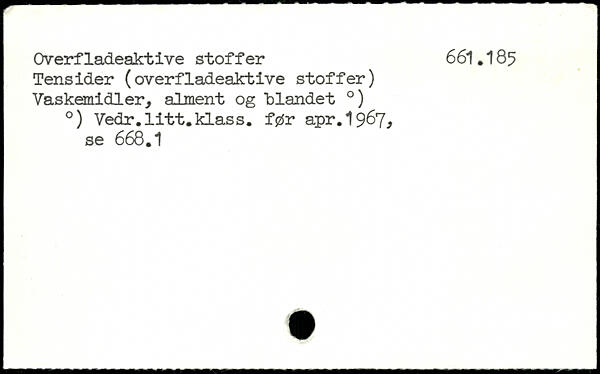 Overfladeaktive stoffer 661.185 Tensider (overfladeaktive stoffer) Vaskemidler, alment og blandet .) .) Vedr.litt.klass. før apr.1967, se 668.1