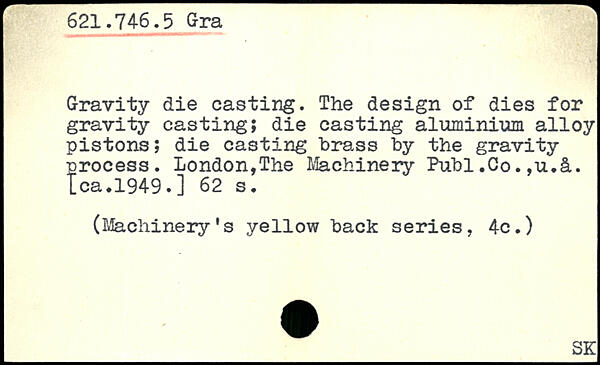 Gravity die casting. The design of dies for gravity casting; die casting aluminium alloy pistons; die casting brass by the gravity process. London,The Machinery Publ.Co.,u.&. Ica.1949.]