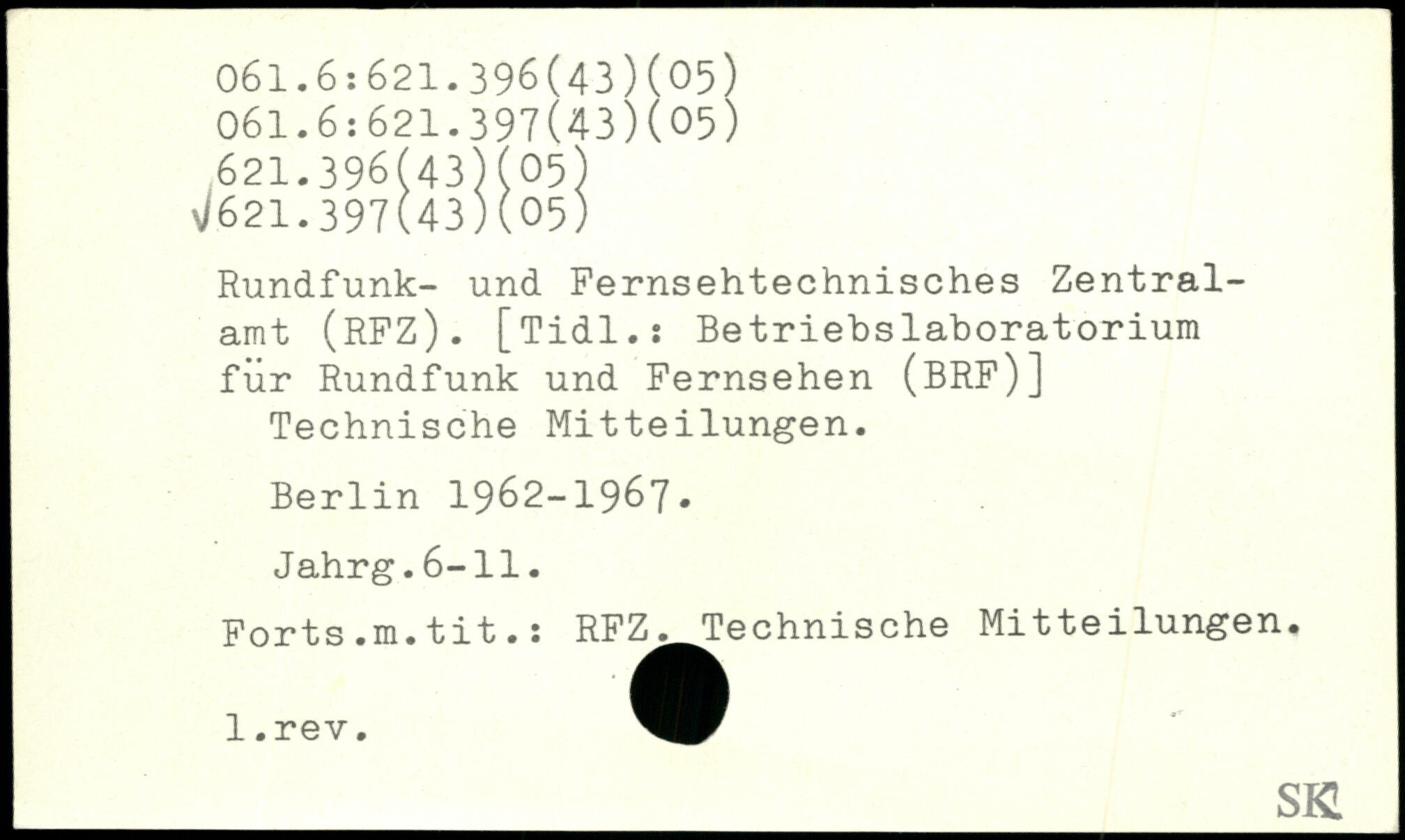 Rundfunk- und Pernsehtechnisches Zentralamt (RFZ). [Tidl.s Betriebslaboratorium für Rundfunk und Fernsehen (BRF)] Technische Mitteilungen.