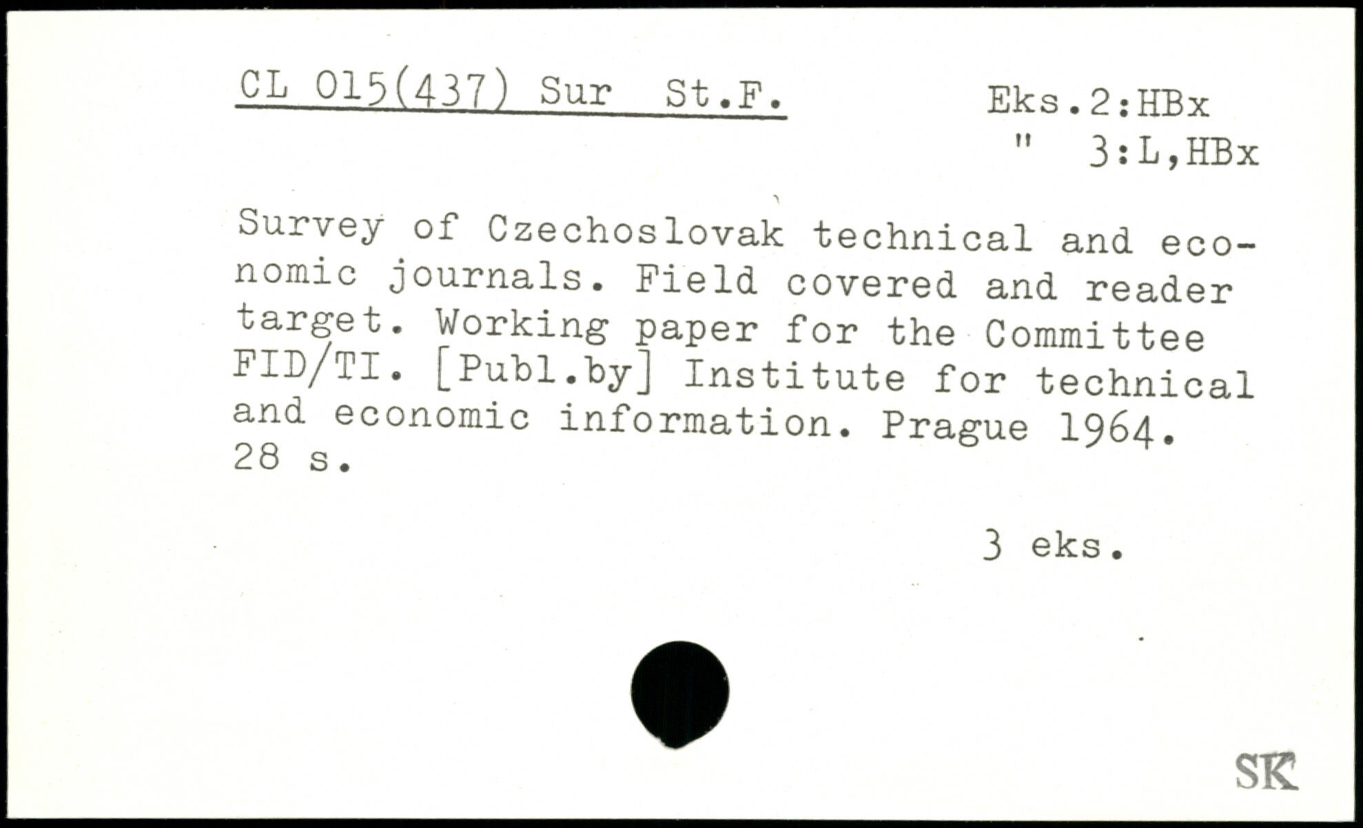 Survey of Czechoslovak technical and economic journals. Field covered and reader target. Working paper for the Committee FIL/TI. [Publ.hy] Institute for technical and economic information.