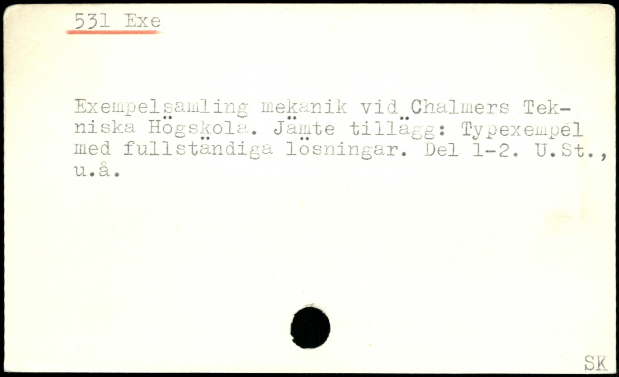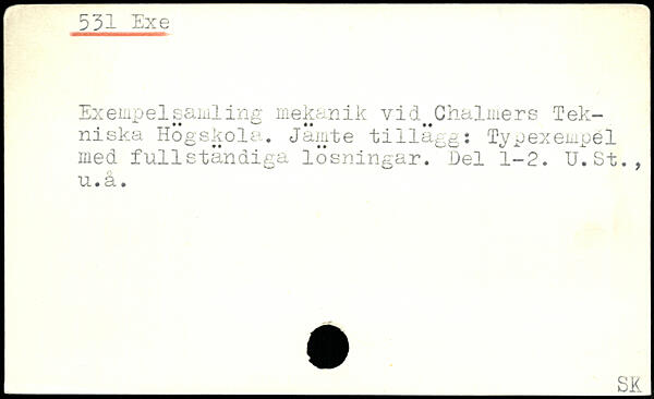 Exempelsamling mekanik vid Chalmers Tekniska Högskola, jämte tillägg: Typexempel ined fullständiga lösningar. Del 1-2. U.St., u.å.
