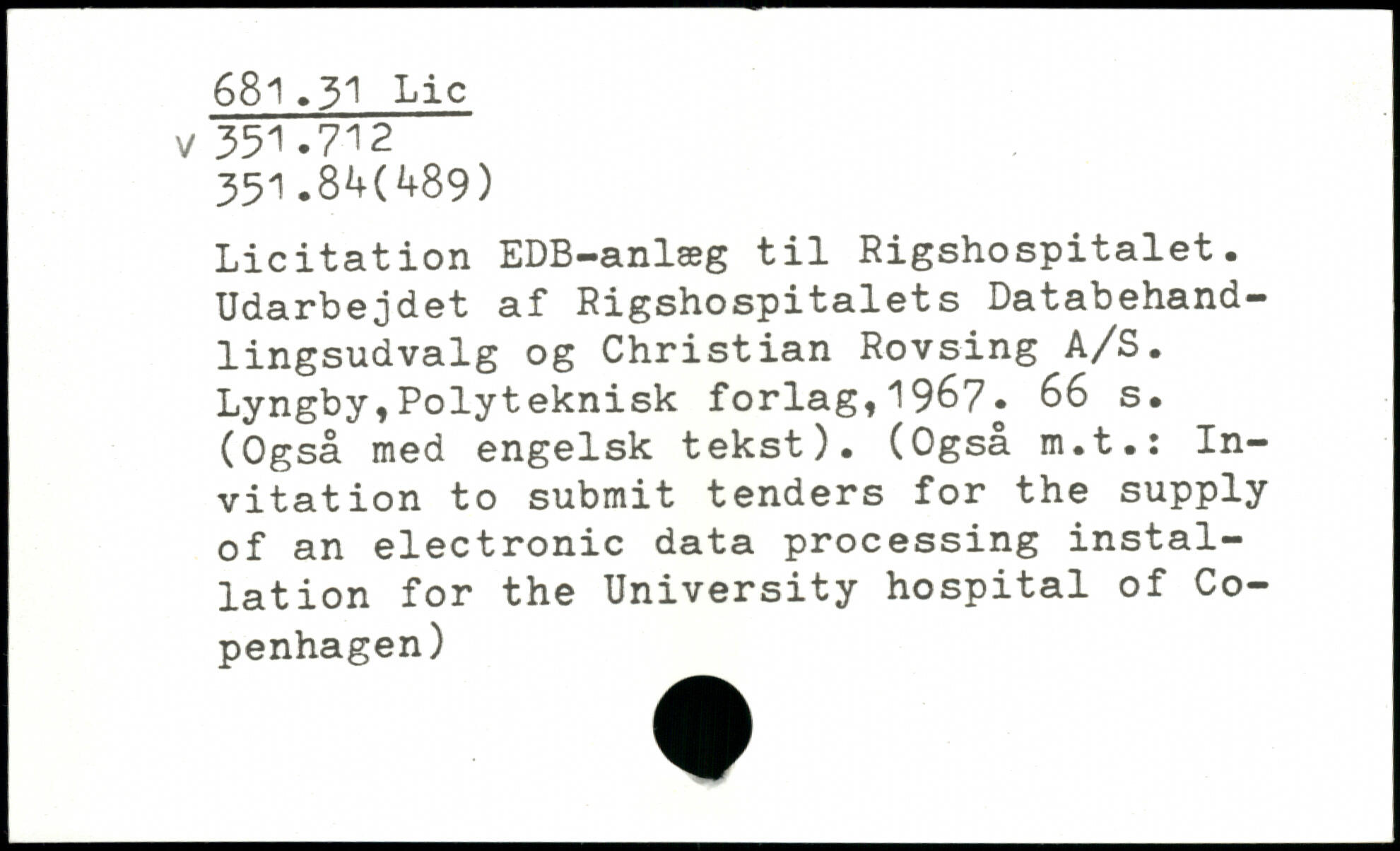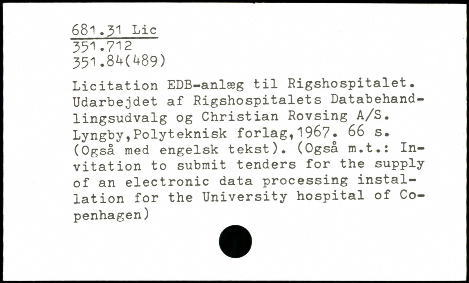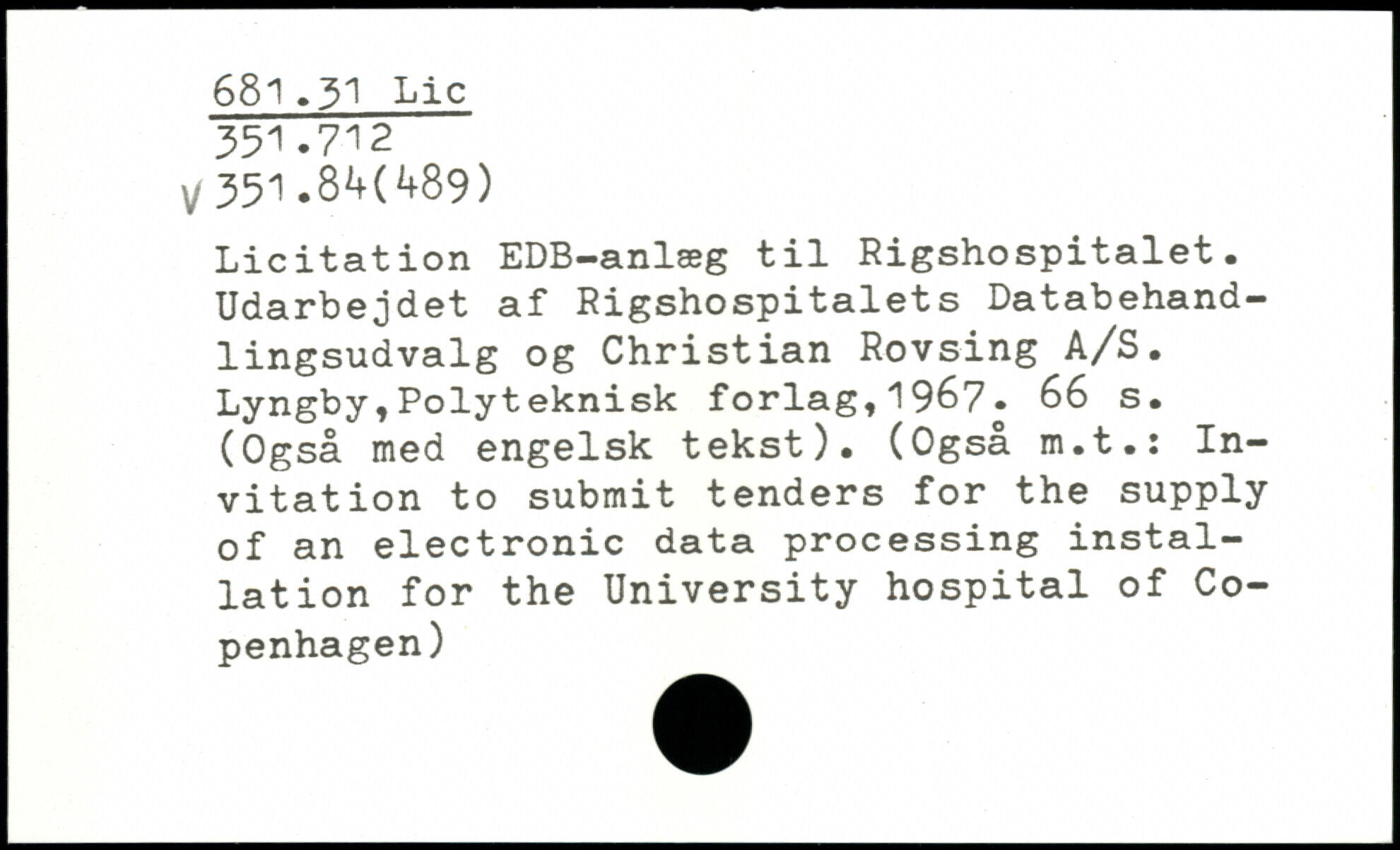 Licitation EDB-anlæg til Rigshospitalet. Udarbejdet af Rigshospitalets Databehandlingsudvalg og Christian Rovsing A/S.
