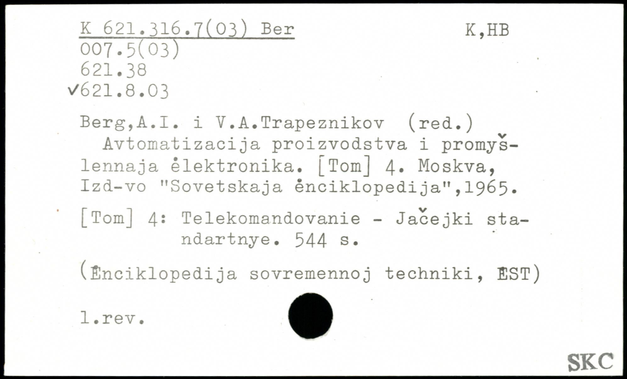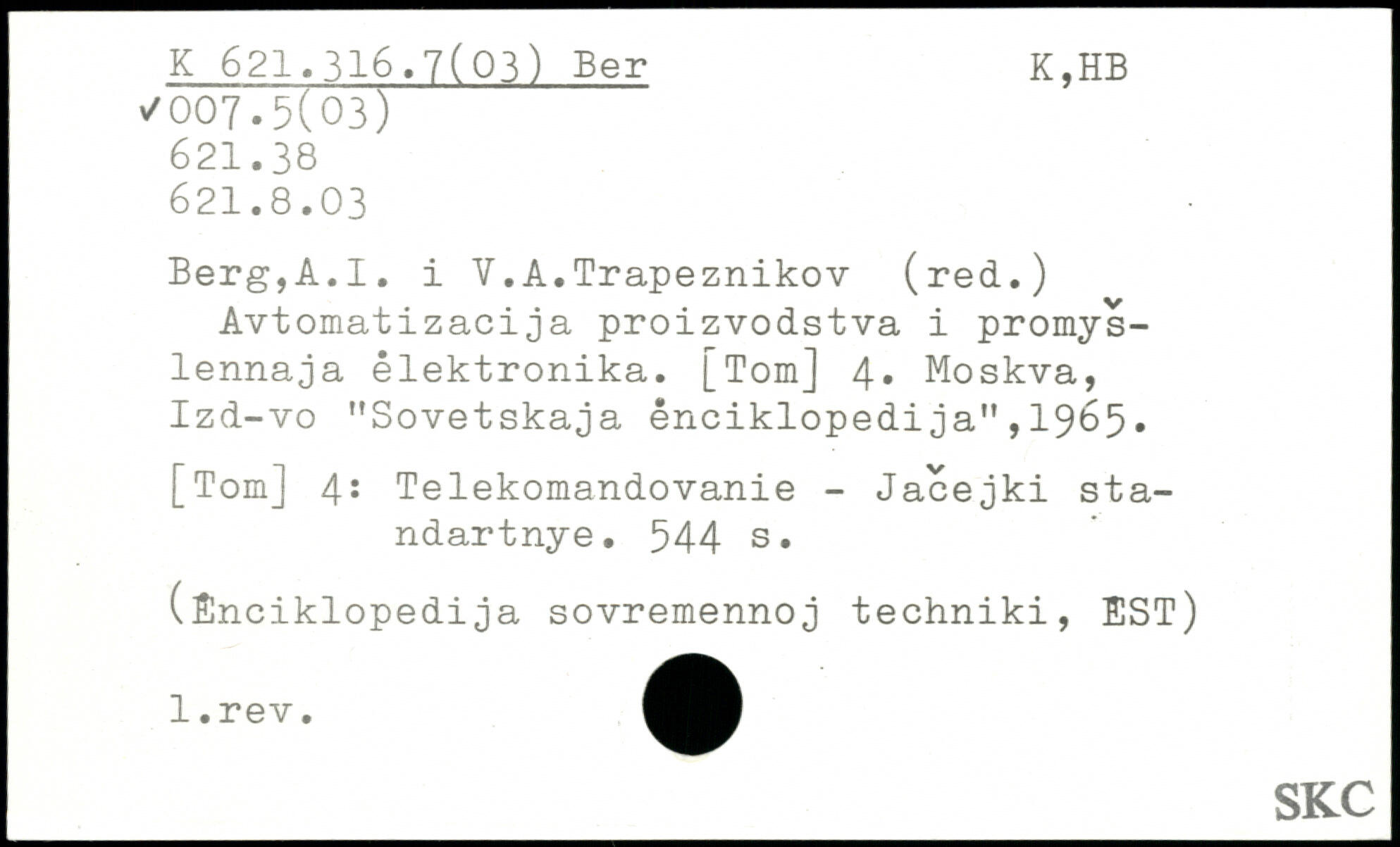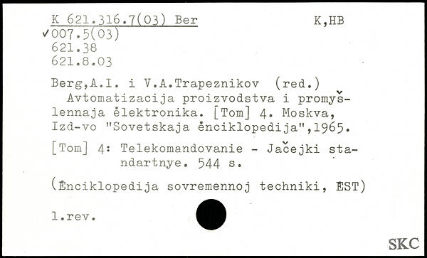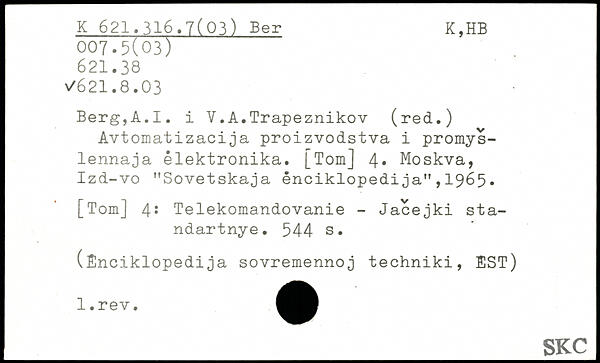 Avtomatizacija proizvodstva i promys-lennaja êlektronika. [Tom] 4. Moskva, Izd-vo "Sovetskaja ênciklopedija",1965. [Tom] 4: Telekomandovanie - Jacejki sta-ndartnye.