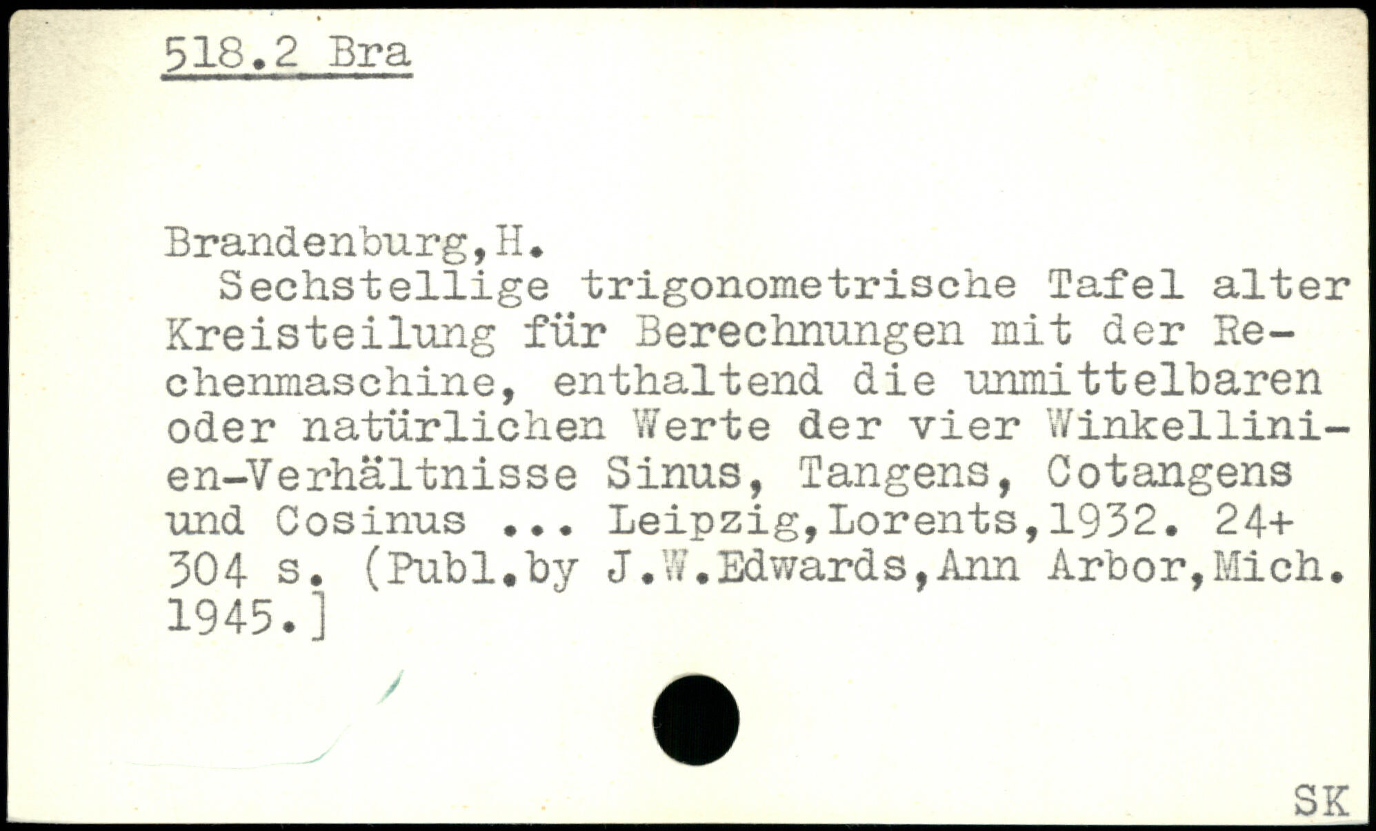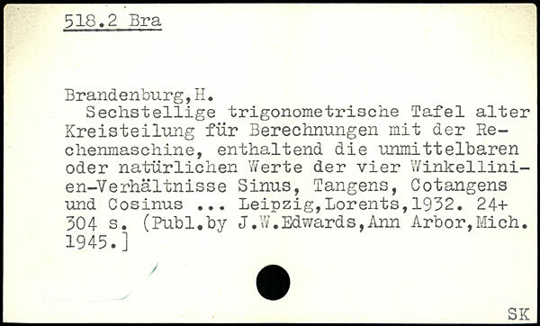 Sechsteilige trigonometrische Tafel alter Kreisteilung für Berechnungen mit der Rechenmaschine, enthaltend die unmittelbaren oder natürlichen Werte der vier Winkellini-en-Verhältnisse Sinus, Tangens, Cotangens und Cosinus ...