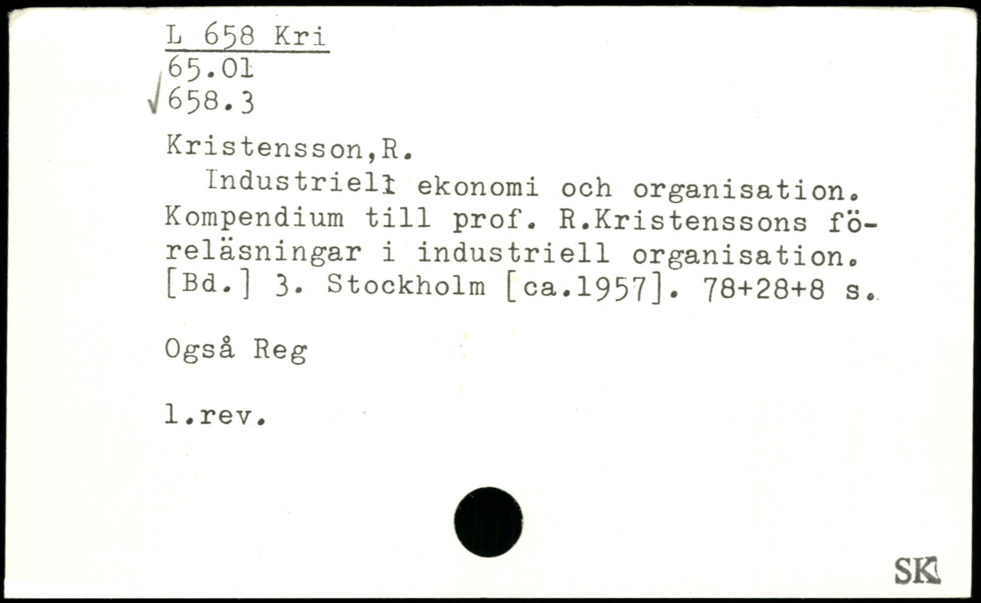 Industriell ekonomi och organisation, Kompendium till prof. R.Kristenssons föreläsningar i industriell organisation. [Bd.] 3. Stockholm [ca.1957].