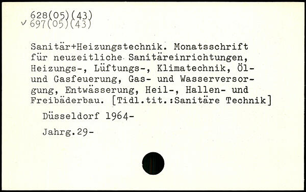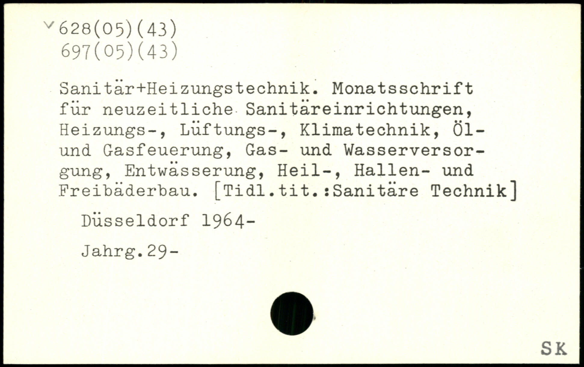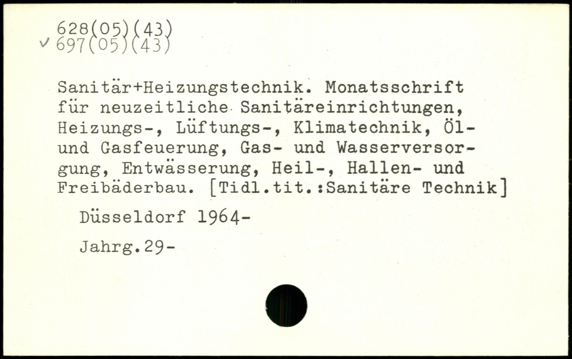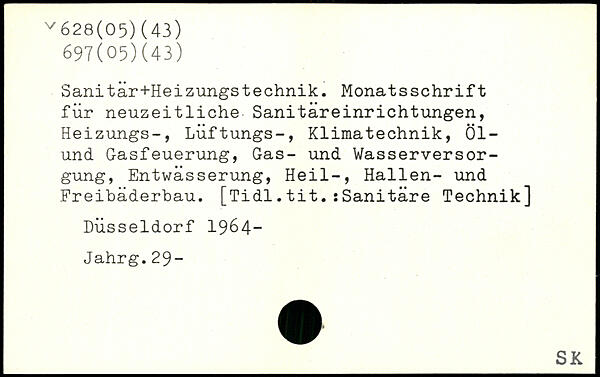 Sanitär+Heizungstechnik. Monatsschrift für neuzeitliche Sanitäreinrichtungen, Heizungs-, Lüftungs-, Klimatechnik, Öl-und Gasfeuerung, Gas- und Wasserversorgung, Entwässerung, Heil-, Hallen- und Freibäderbau. [Tidl.tit. sSanitäre Technik] Düsseldorf 1964- Jahrg.29-