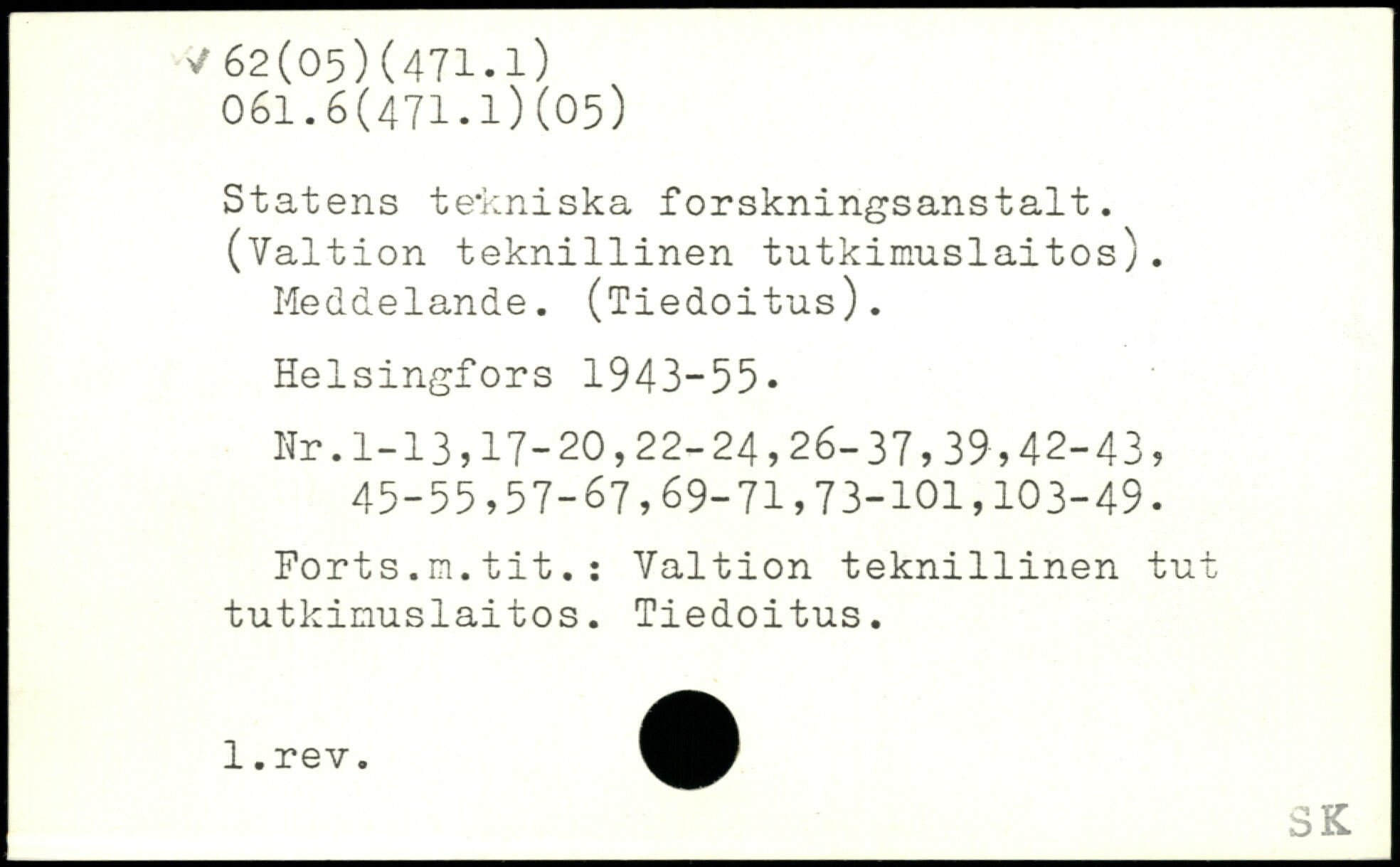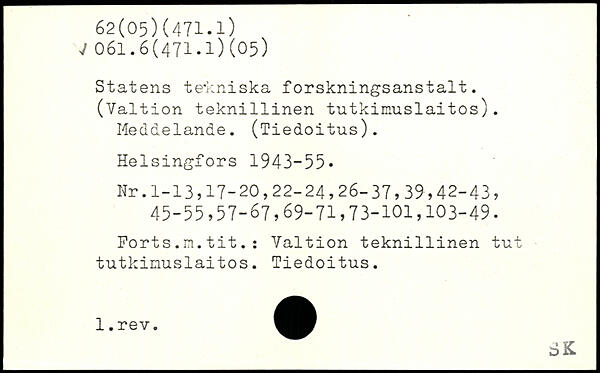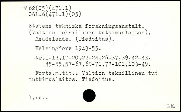 Statens tekniska forskningsanstalt. (Valt ion tekn1111nen tutkimuslaitos). Meddelande. (Tiedoitus).