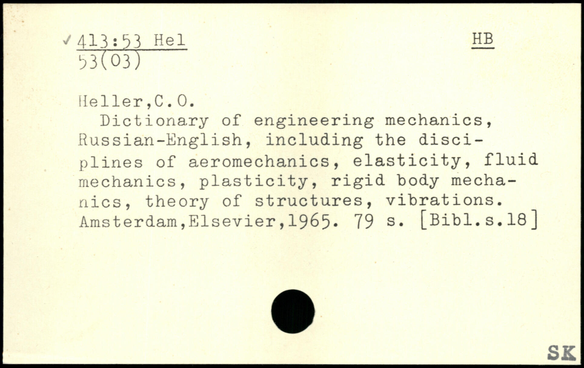 Dictionary of engineering mechanics, Russian-English, including the disciplines of aeromechanics, elasticity, fluid mechanics, plasticity, rigid body mechanics, theory of structures, vibrations.