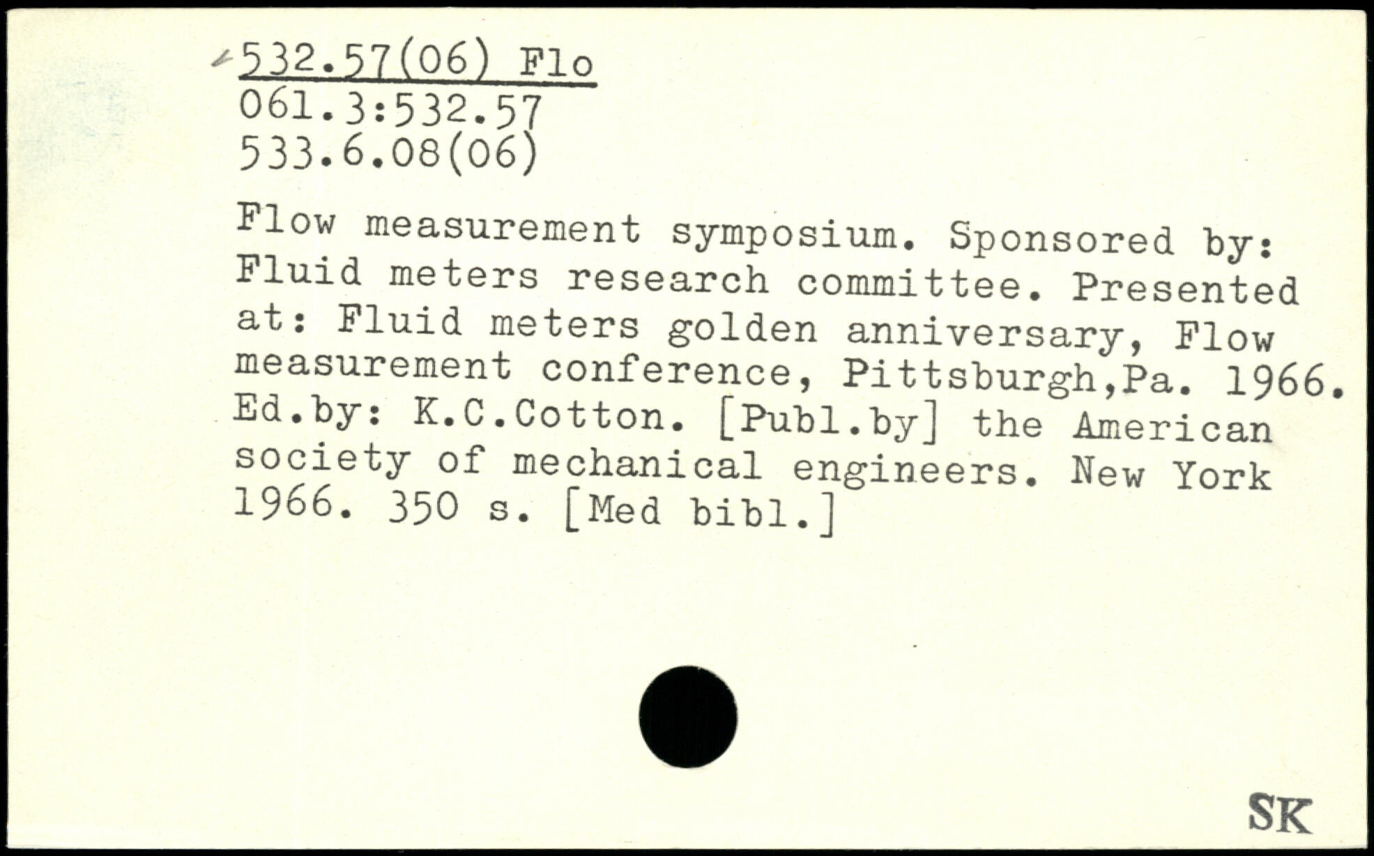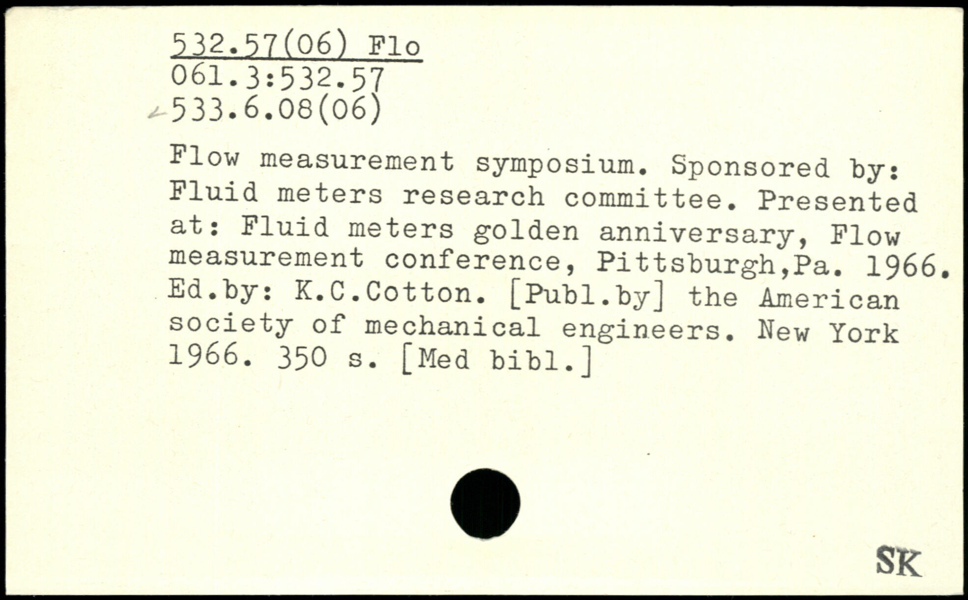 Flow measurement symposium. Sponsored by: Fluid meters research committee. Presented at: Fluid meters golden anniversary, Plow measurement conference, Pittsburgh,Pa. 1966. Ed.by: K.C.Cotton.