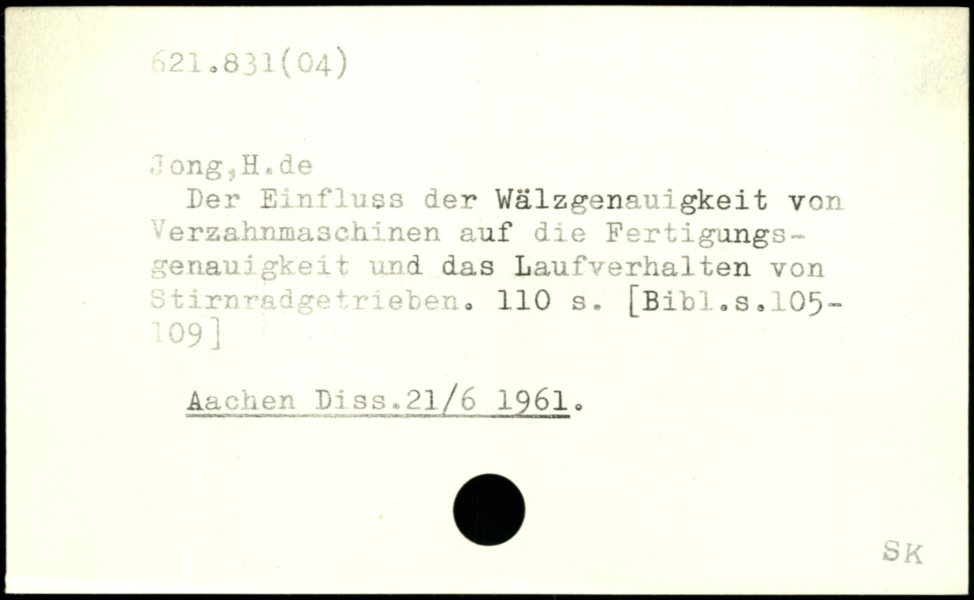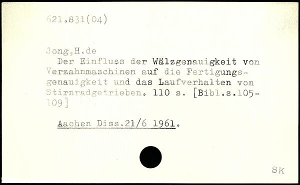 Jong s H.de Der Einfluss der Wälzgenauigkeit von .rzahnmaschinen auf die Fertigungs-genau!gkeit und das Laufverhalten von Stirnradgetrieben