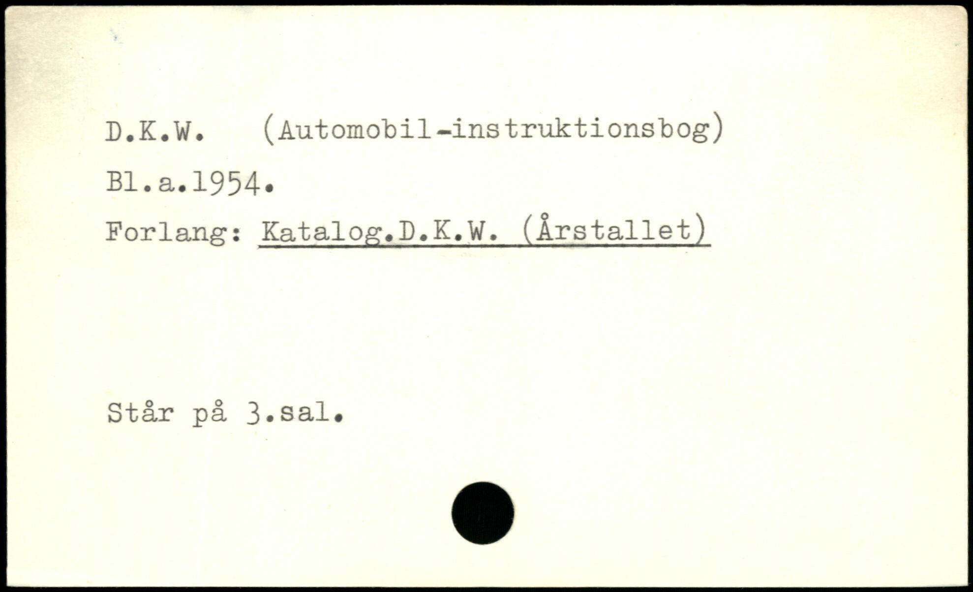 D.K.W. (Automobil-instruktionsbog) Bl.a.1954. Forlang: Katalog.D.K.W. (Årstallet) Står på 3,sal.