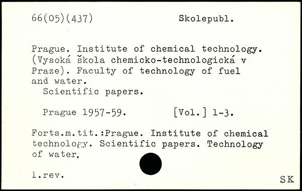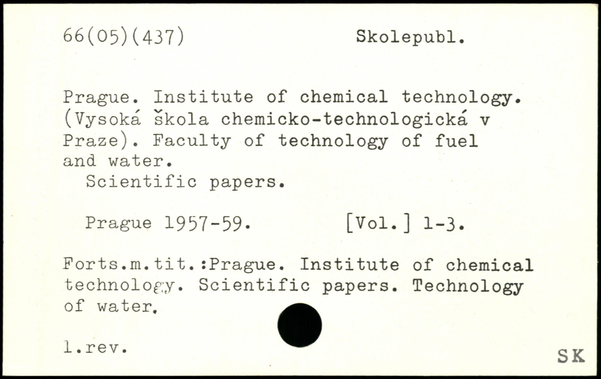 Prague. Institute of chemical technology. (Vysoka skola chemicko-technologicka v Praze). Faculty of technology of fuel and water. Scientific papers.