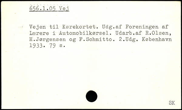 Vejen til Kørekortet. Udg.af Foreningen af Lærere i Automobilkørsel. Udarb.af R.Olsen, H.Jørgensen og F.Schmitto. 2,Udg.
