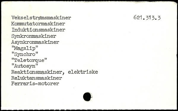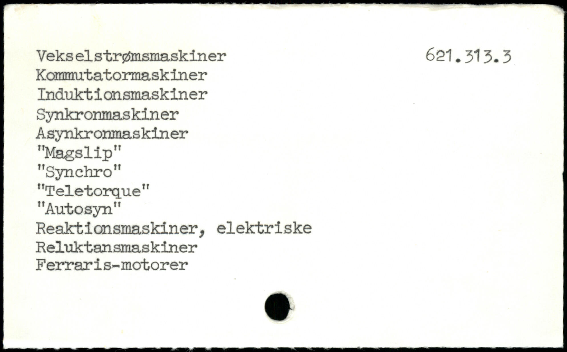 Kommutatormaskiner Indukt i onsmasklner Synkronmaskiner Asynkronmaskiner "Magslip" "Synchro" "Teletorque" "Autosyn" Reaktionsmaskiner, elektriske Reluktansmaskiner Ferrar i s-motor er
