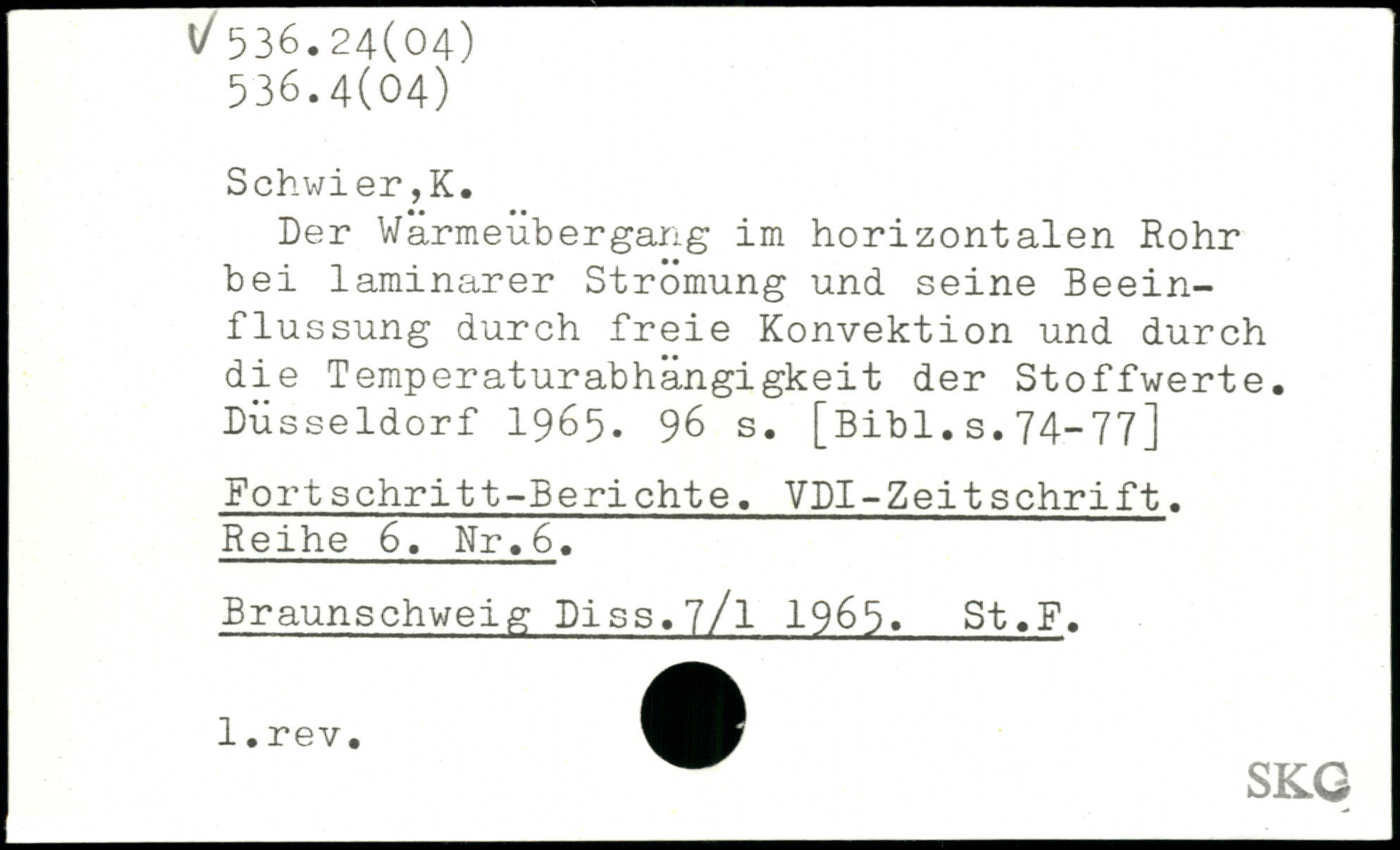 Der Wärmeübergang im horizontalen Rohr bei laminarer Strömung und seine Beeinflussung durch freie Konvektion und durch die Temperaturabhängigkeit der Stoffwerte. Düsseldorf 1965.