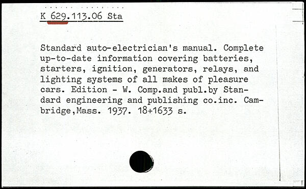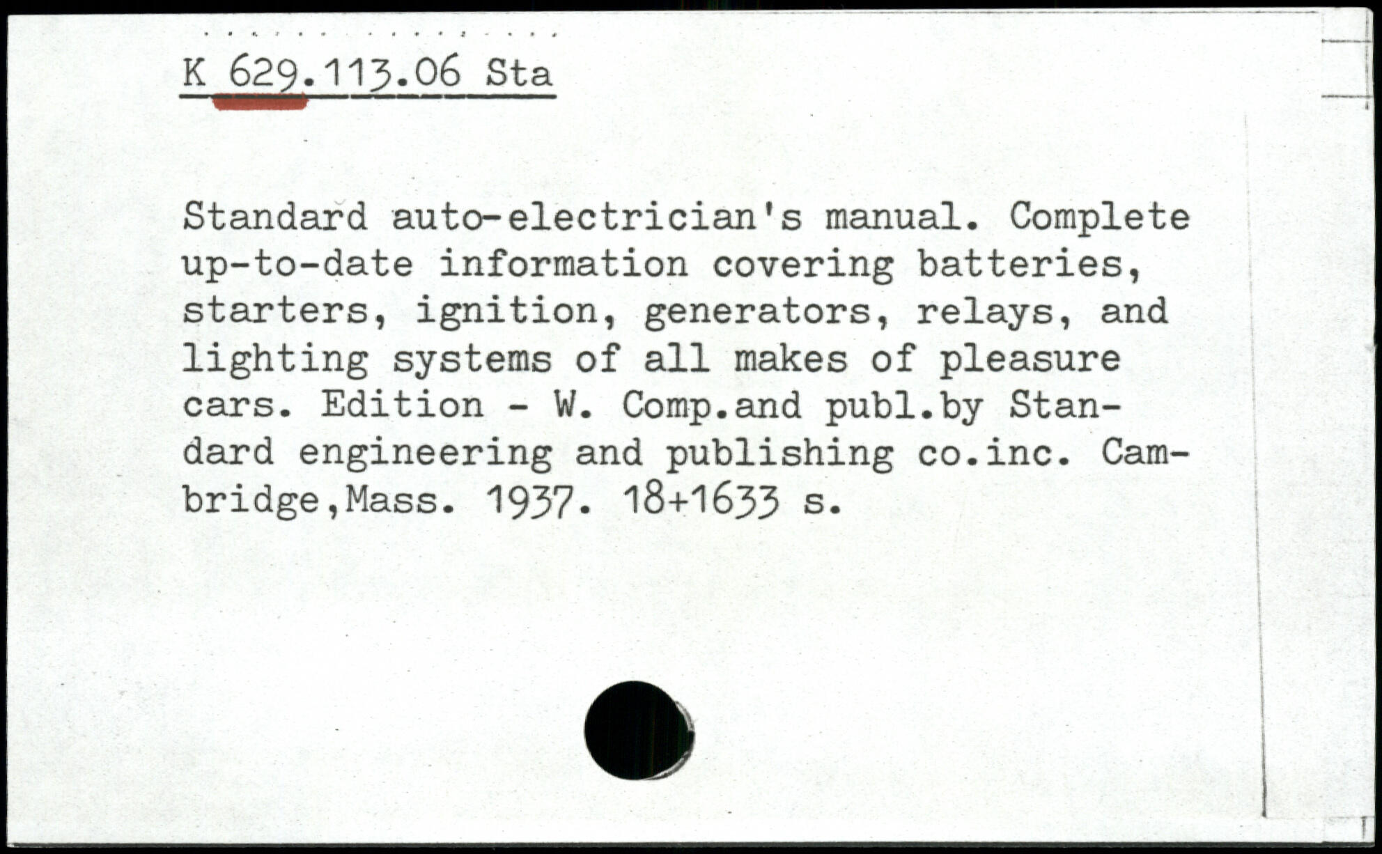 Standard auto-electrician's manual. Complete up-to-date information covering batteries, starters, ignition, generators, relays, and lighting systems of all makes of pleasure cars. Edition - W. Comp.and publ.by Standard engineering and publishing co.inc. Cambridge,Mass. 1937-