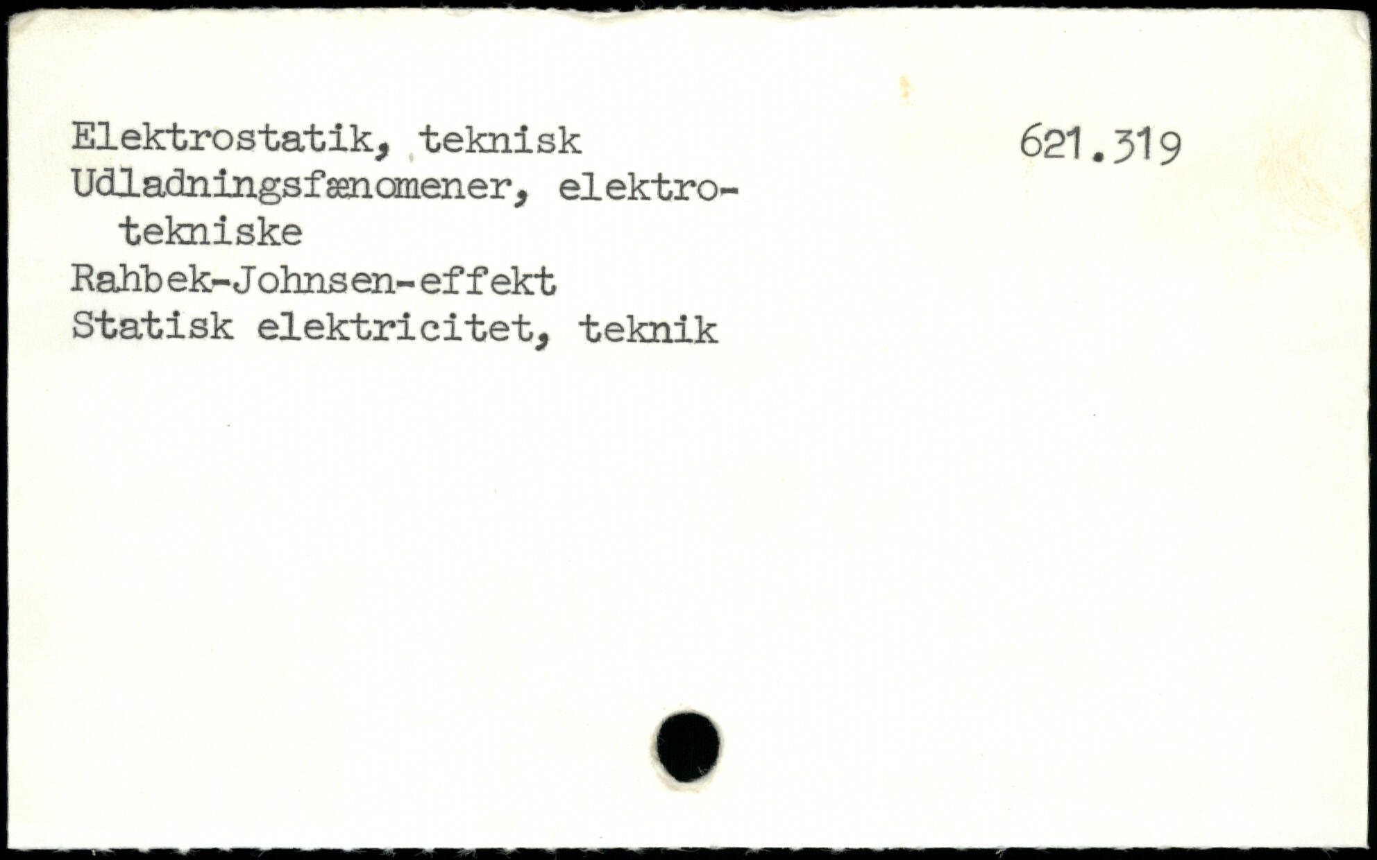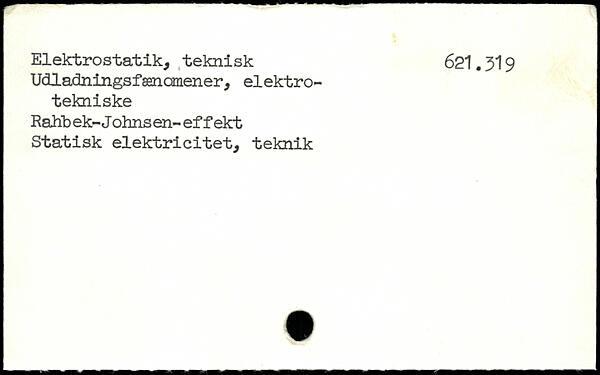Elektrostatik, teknisk 621.319 Udladningsfænomener, elektrotekniske Rafrb ek-Johnsen-effekt Statisk elektricitet, teknik