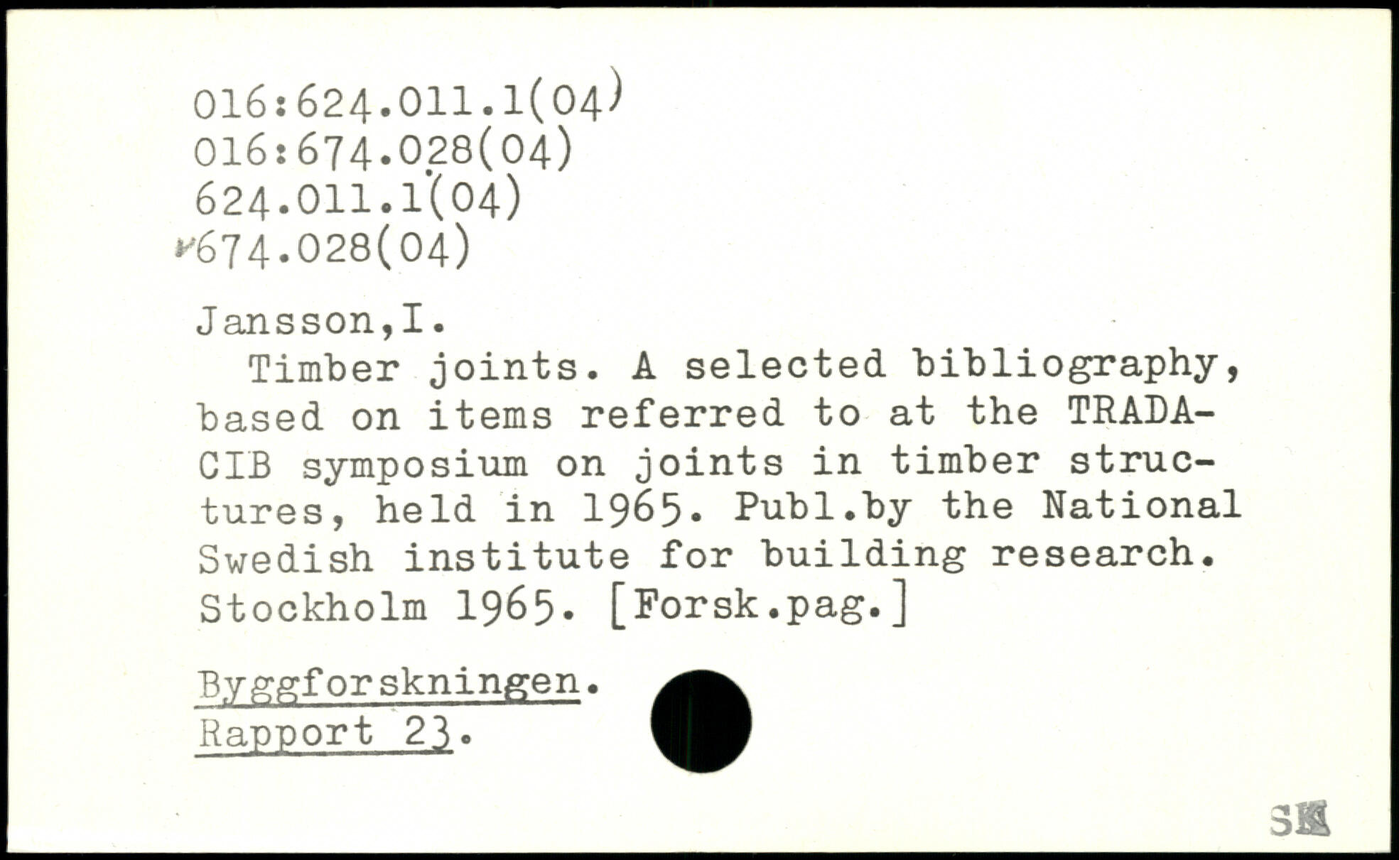 Timber joints. A selected bibliography, based on items referred to at the TRADA-CIB symposium on joints in timber structures, held in 1965. Publ,by the National Swedish institute for building research.