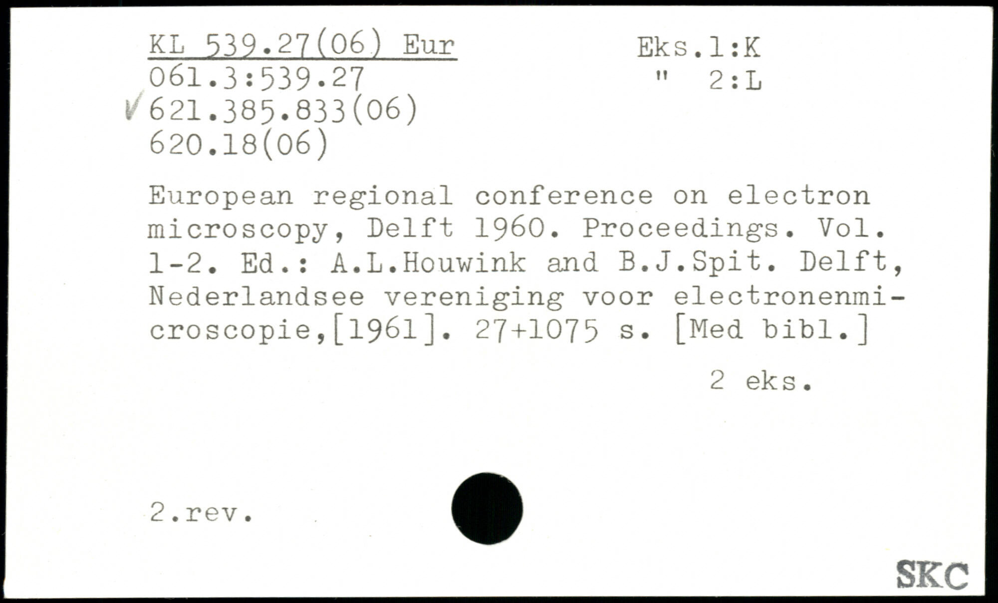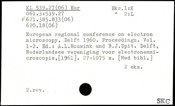 European regional conference on electron microscopy, Delft 1960. Proceedings. Vol. 1-2. Ed.: A.L.Houwink and B.J.Spit.