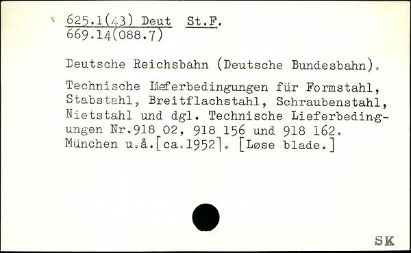 Deutsche Reichsbahn (Deutsche Bundesbahn), Technische lieferbedingungen für Formstahl, Stabstahl, Breitflachstahl, Schraubenstahl, Nietstahl, und dgl. Technische Lieferbedingungen Nr.918 02, 918 156 und 918 162. München u.ä.[ca.1952]. [Lose blade.]