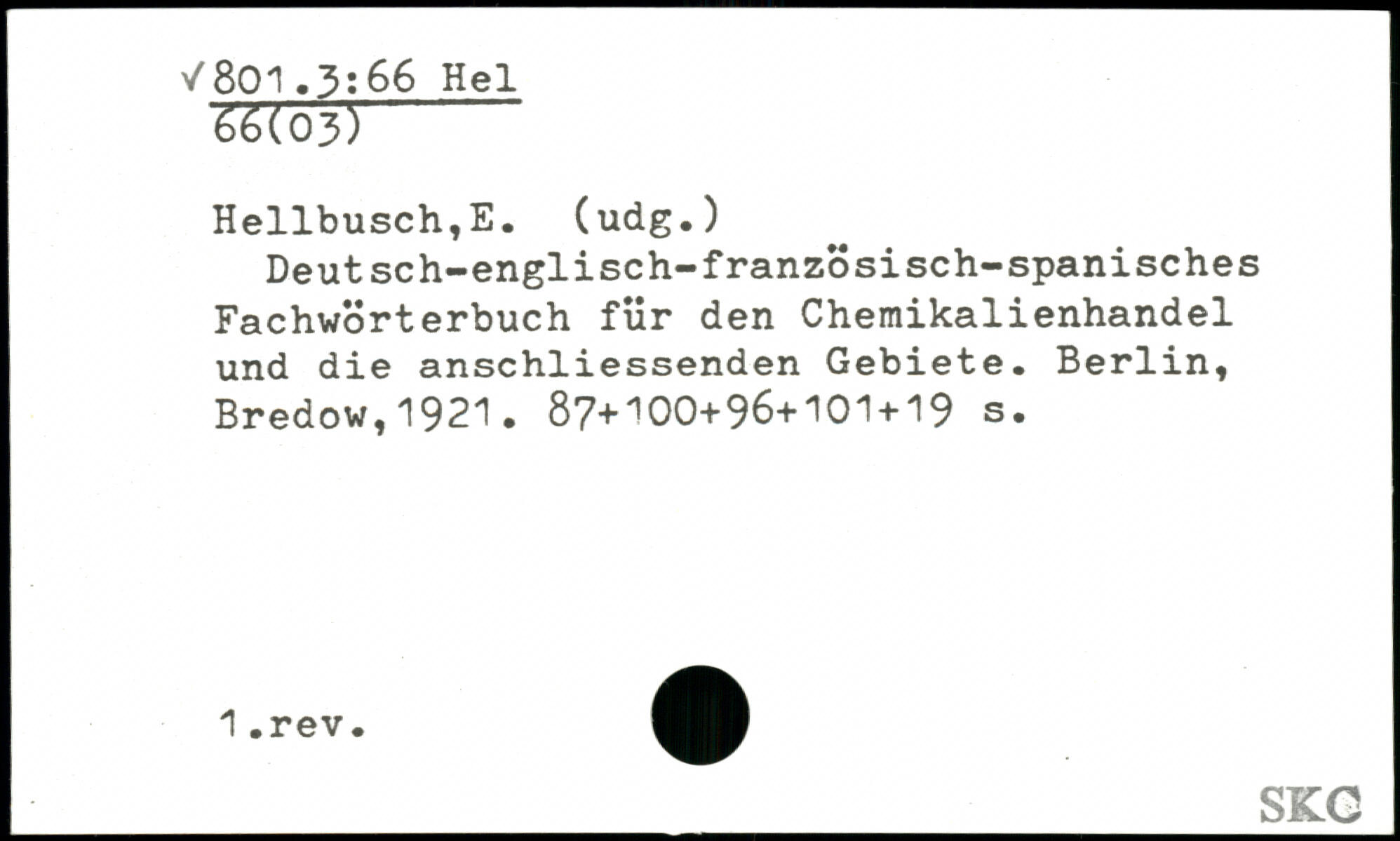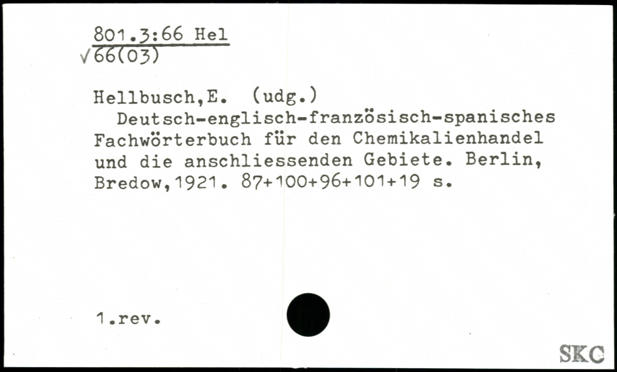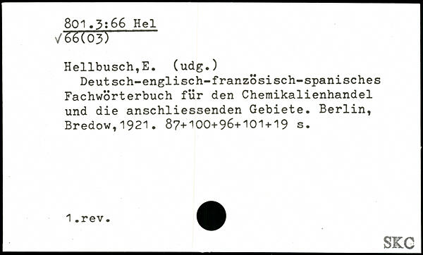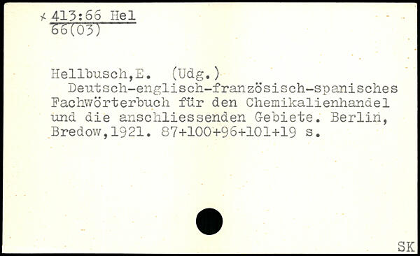 Hellbusch,E. (üdg.) Deutsch-englisch-französisch-spanisches Fachwörterbuch für den Chemikalienhandel und die anschliessenden Gebiete.