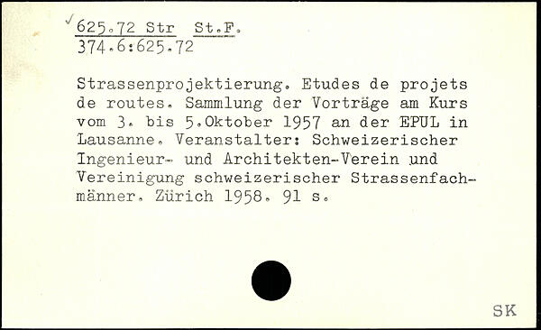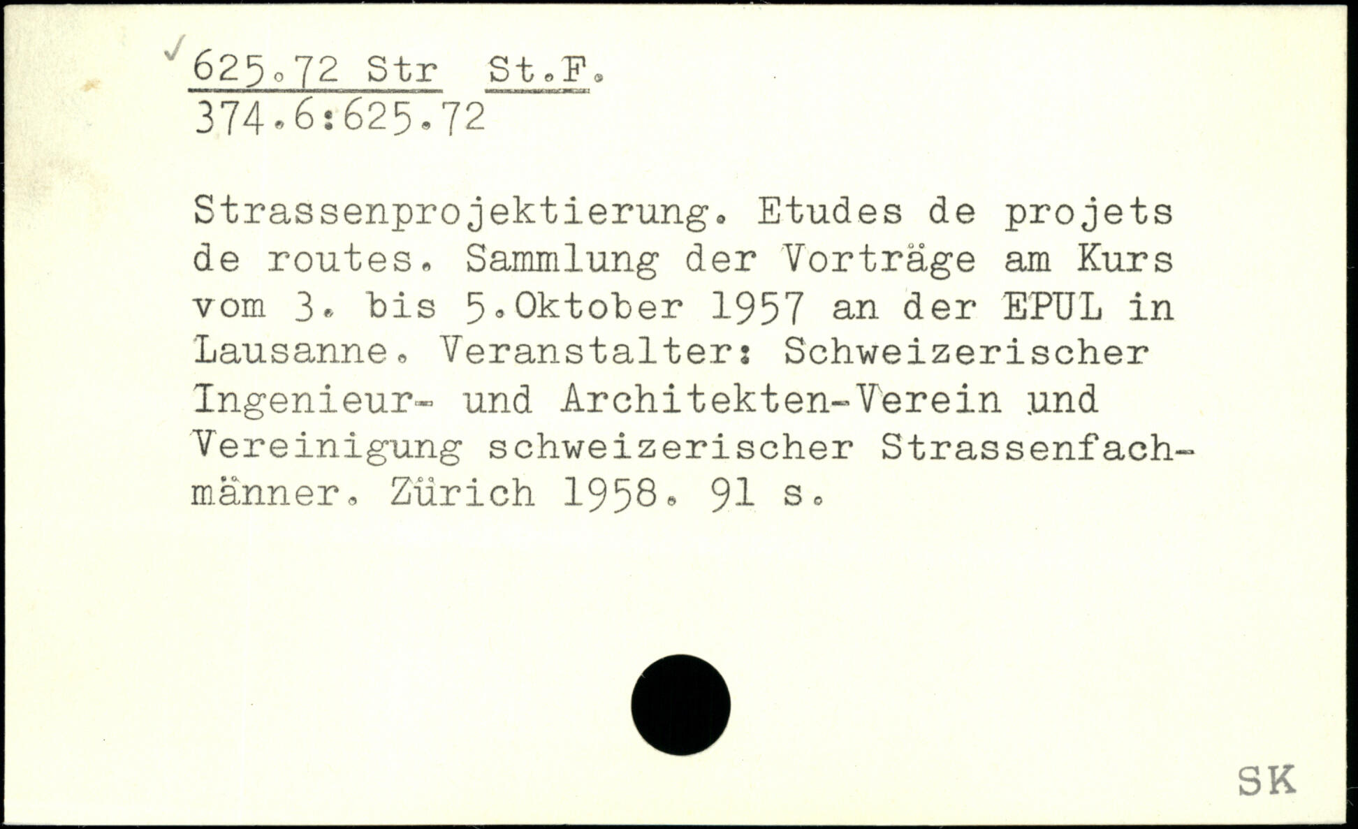 Strassenprojektierungo Etudes de projets de routes, Sammlung der Vorträge am Kurs vom 3. bis 5,Oktober 1957 an der EPUL in Lausanne, Veranstalter: Schweizerischer Ingenieur, und Architekten-Verein und Vereinigung schweizerischer Strassenfach-männer, Zürich 1958