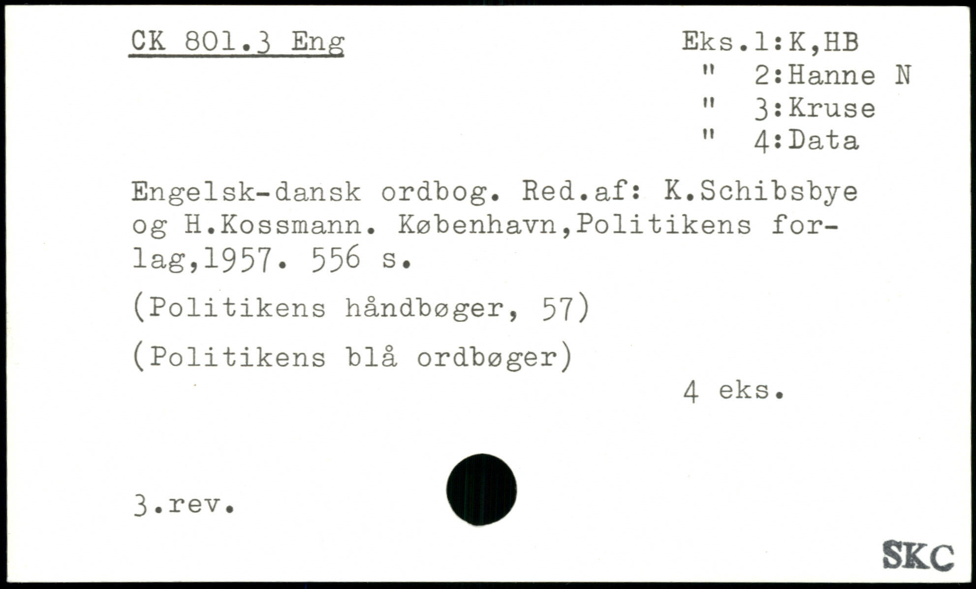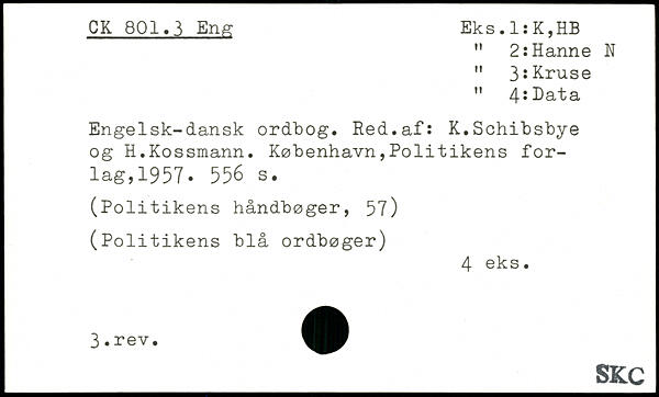 M 2:Hanne N " 3.Kruse " 4:^ata Engelsk-dansk ordbog. Red.af: K.Schibsbye og H.Kossmann.