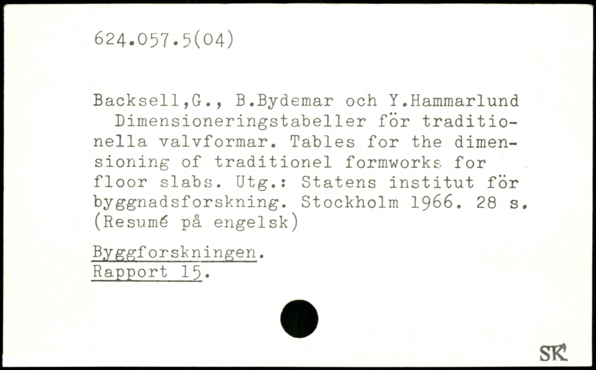BackselljG., B.Bydemar och Y.Hammarlund Dimensioneringstabeller for traditionella valvformar. Tables for the dimensioning of traditionel formworks for floor slabs. Utg.: Statens institut för byggnadsforskning.