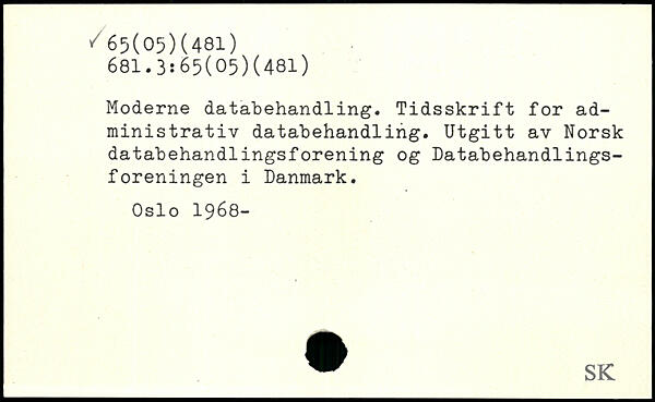 Moderne databehandling. Tidsskrift for administrativ databehandling. Utgitt av Norsk databehandlingsforening og Databehandlingsforeningen i Danmark. Oslo 1968-