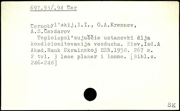 Sernoby1’ski3,!.!., O.A.Kremnev, A.S.£avdarov Teploispol1zujuscie ustanovki dlja kondicionitovanija vozducha. Kiev,Izd.A Akad.Nauk Ukrainskoj SSR,1958.