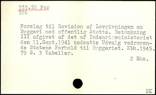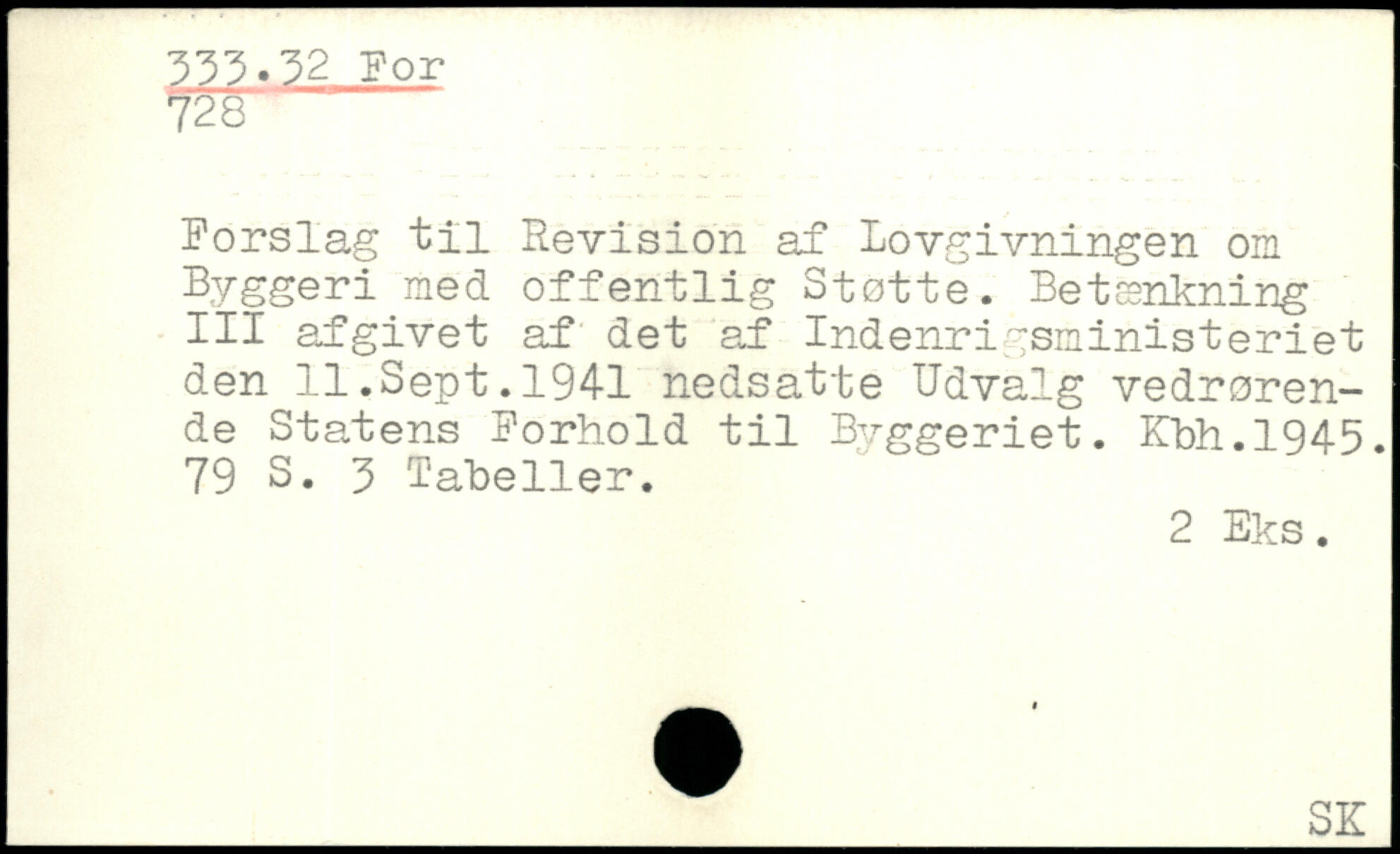 Forslag til Revision af Lovgivningen om Byggeri med offentlig Støtte. Betænkning III afgivet af det af Indenrigsministeriet den ll.Sept.1941 nedsatte Udvalg vedrørende Statens Forhold til Byggeriet. Kbh.1945.