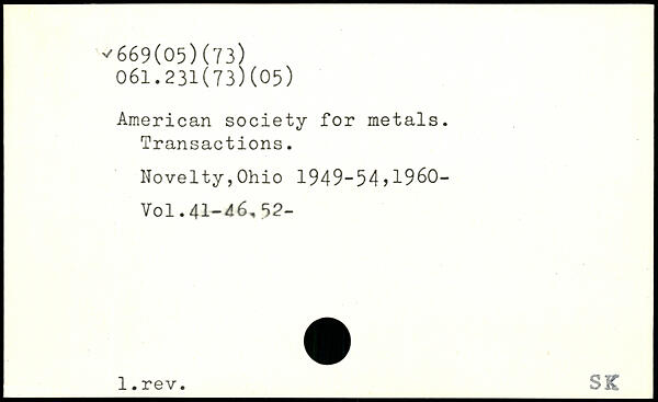 American society for metals. Transactions. Novelty,Ohio 1949-54>1960-