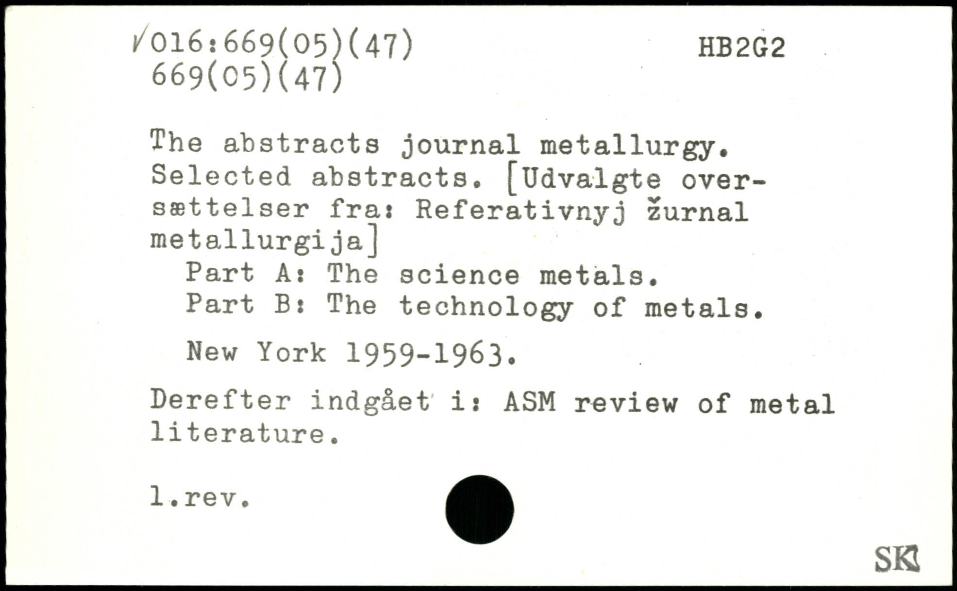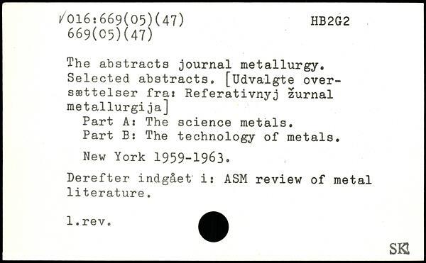 The abstracts journal metallurgy. Selected abstracts. [Udvalgte over-sættelser fra: Referativnyj zurnal metallurgija] Part A: The science metals. Part B: The technology of metals.