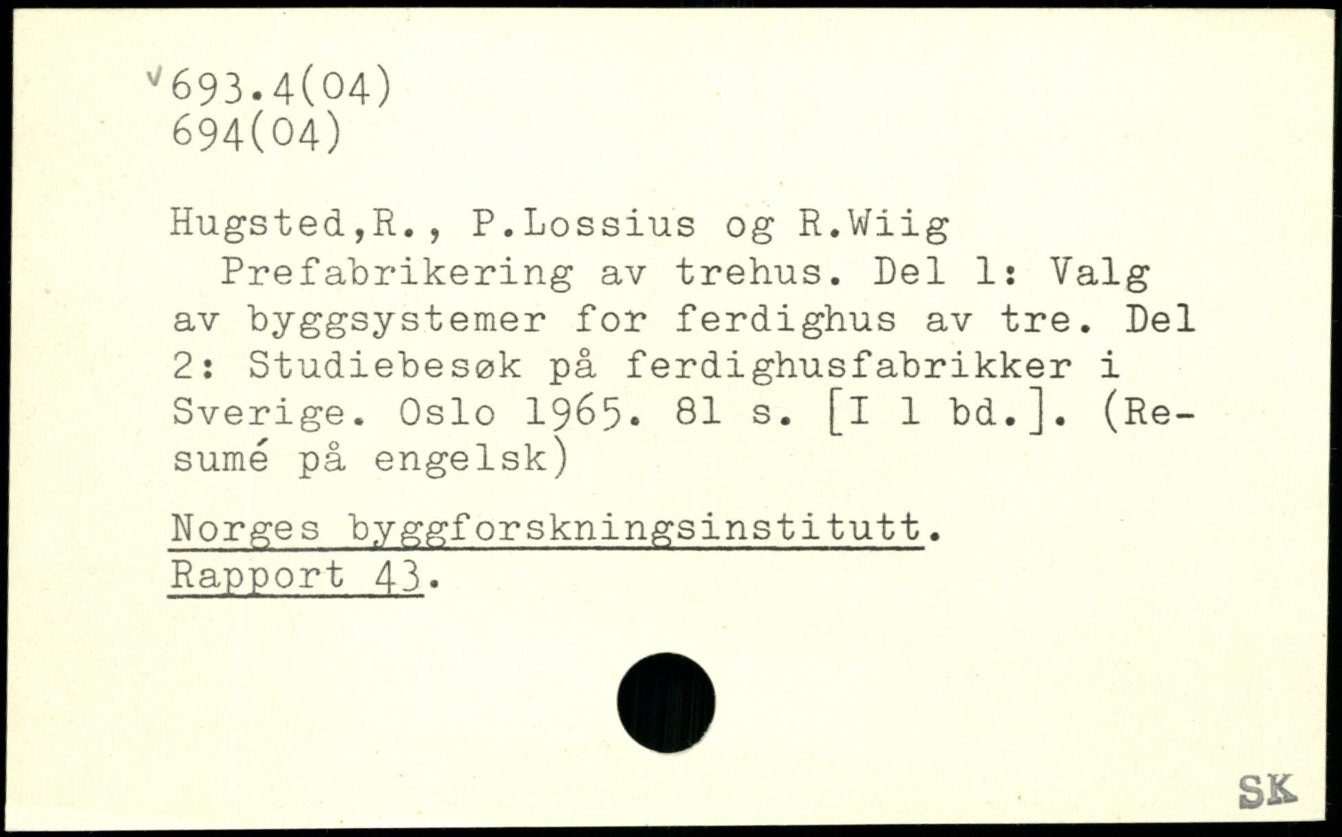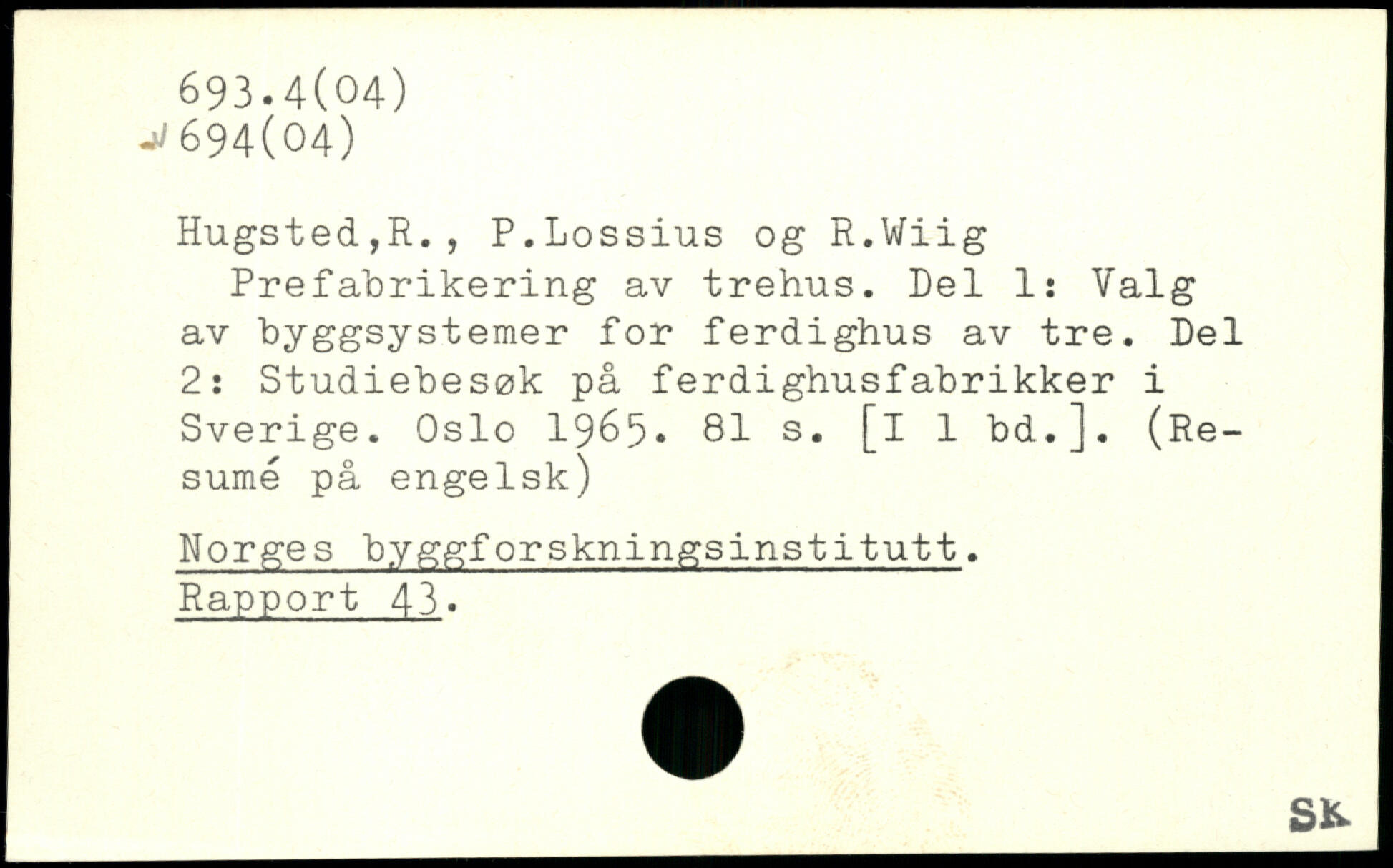 Prefabrikering av trehus. Del 1: Valg av byggsystemer for ferdighus av tre. Del 2: Studiebesøk på ferdighusfabrikker i Sverige. Oslo 1965