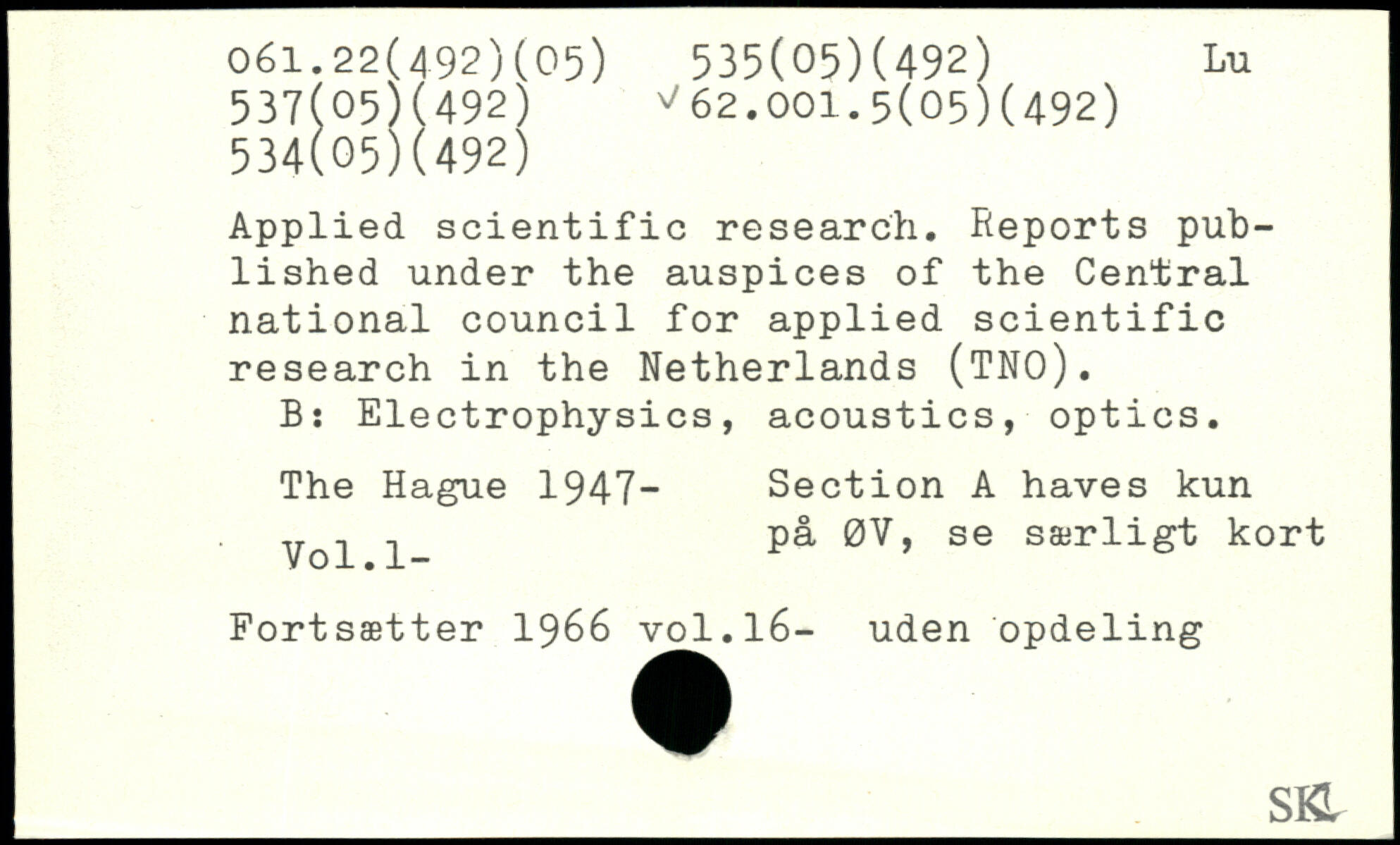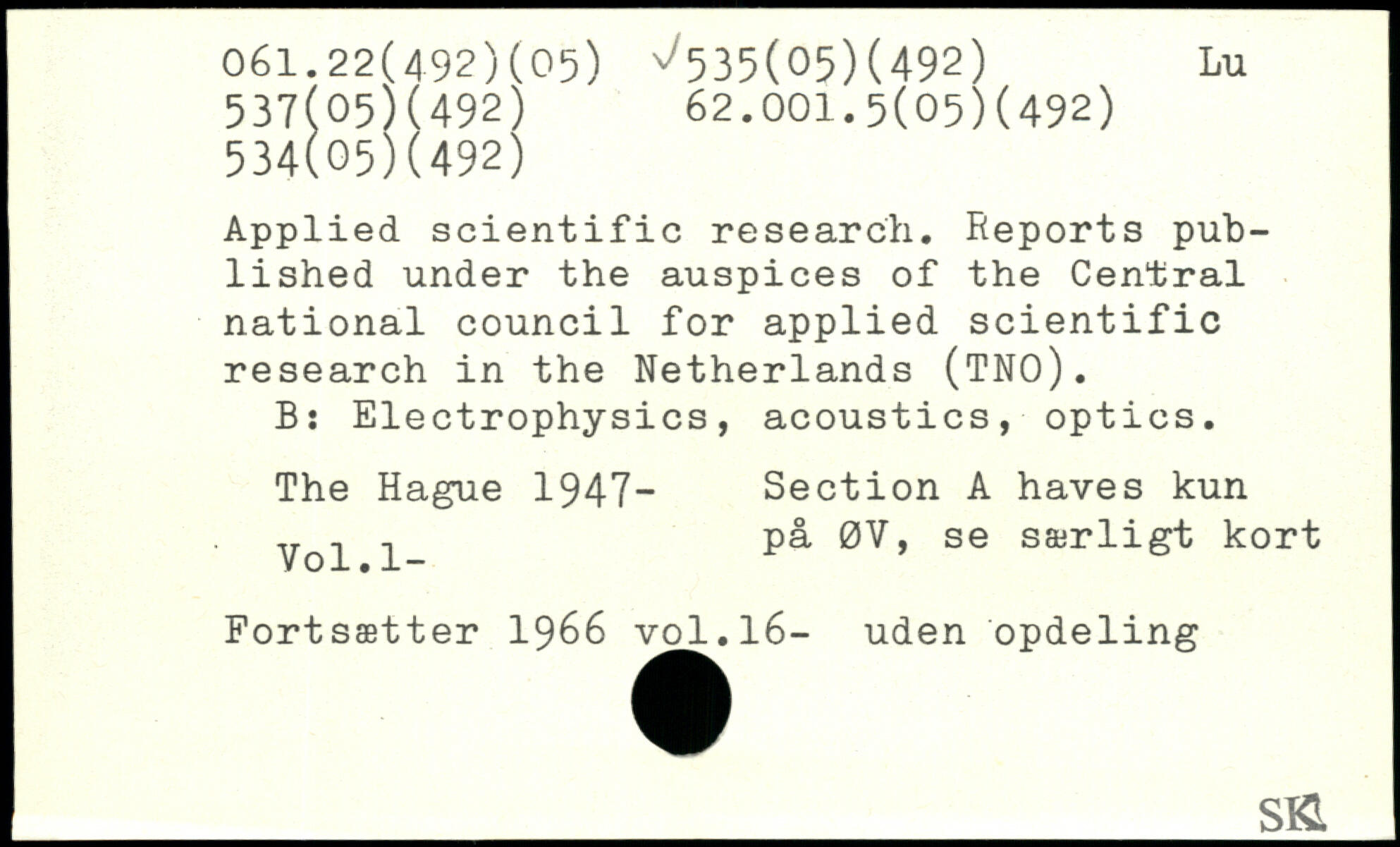 Applied scientific research. Reports published under the auspices of the Central national council for applied scientific research in the Netherlands (TNO). B: Electrophysics, acoustics, optics.