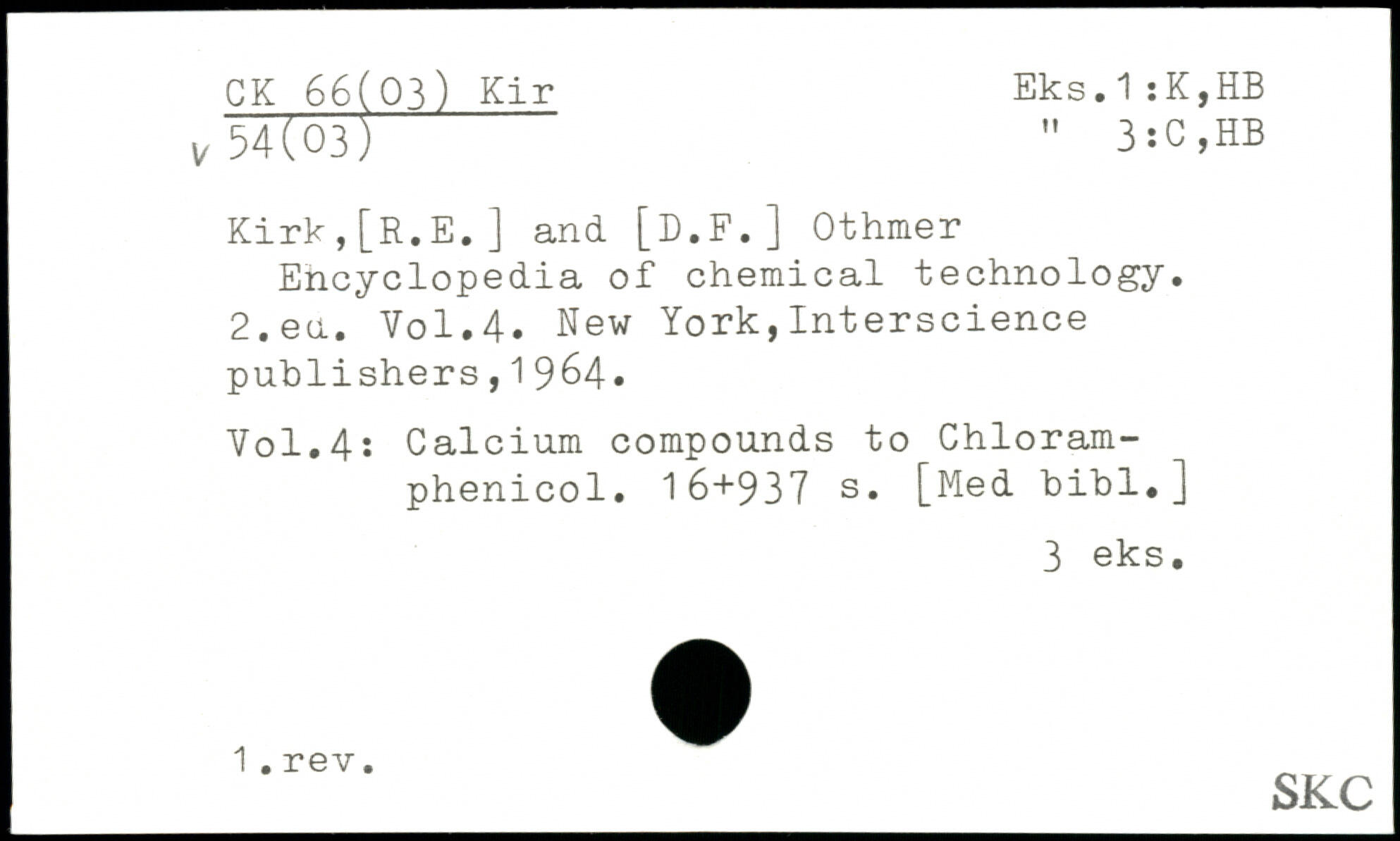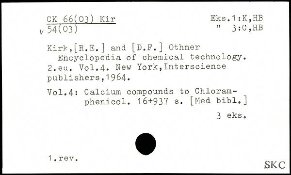Kirk,[R.E.] and [D.F.] Othmer Encyclopedia of chemical technology. 2.ea.