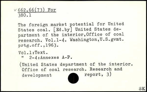 The foreign market potential for United States coal. [Ed.by] United States department of the interior,Office of coal research.