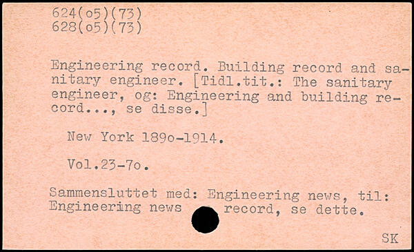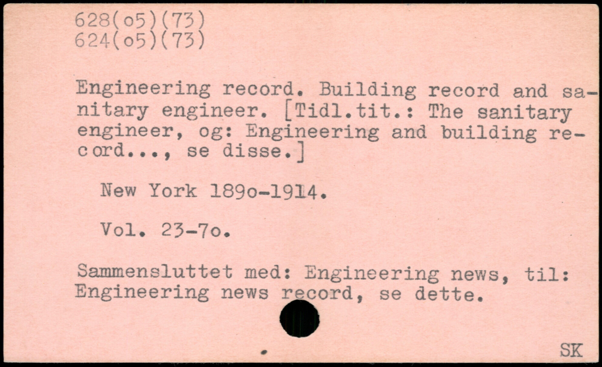 Engineering record. Building record and sanitary engineer. [Tidl.tit.: The sanitary engineer, og: Engineering and building record..., se disse.] New York 189o-1914. Vol. 23-7o. Sammensluttet med: Engineering news, til: Engineering news i^^ord, se dette. _._SE