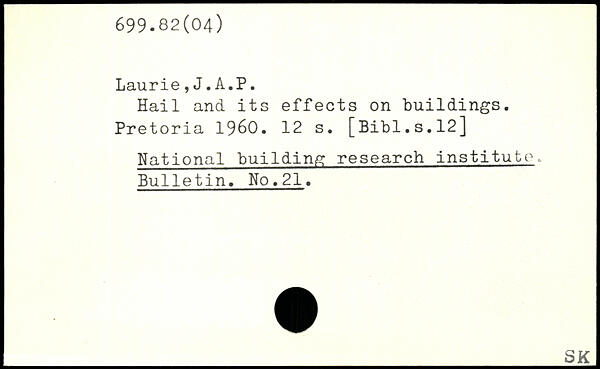 Hail and its effects on buildings. Pretoria 1960.
