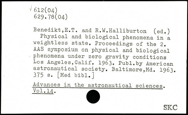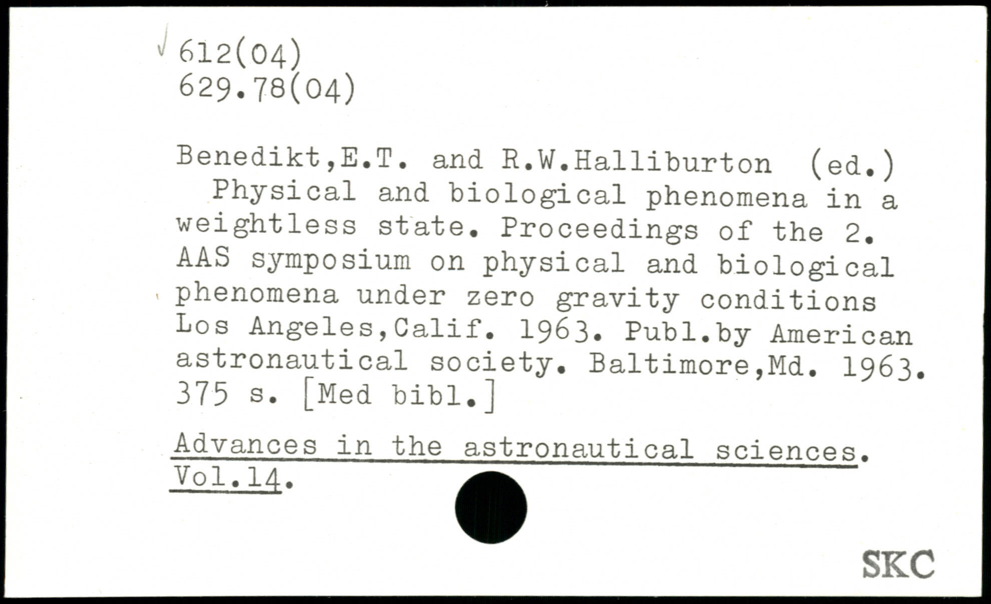 Physical and biological phenomena in a weightless state. Proceedings of the 2. AAS symposium on physical and biological phenomena under zero gravity conditions Los Angeles,Calif. 1963.