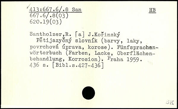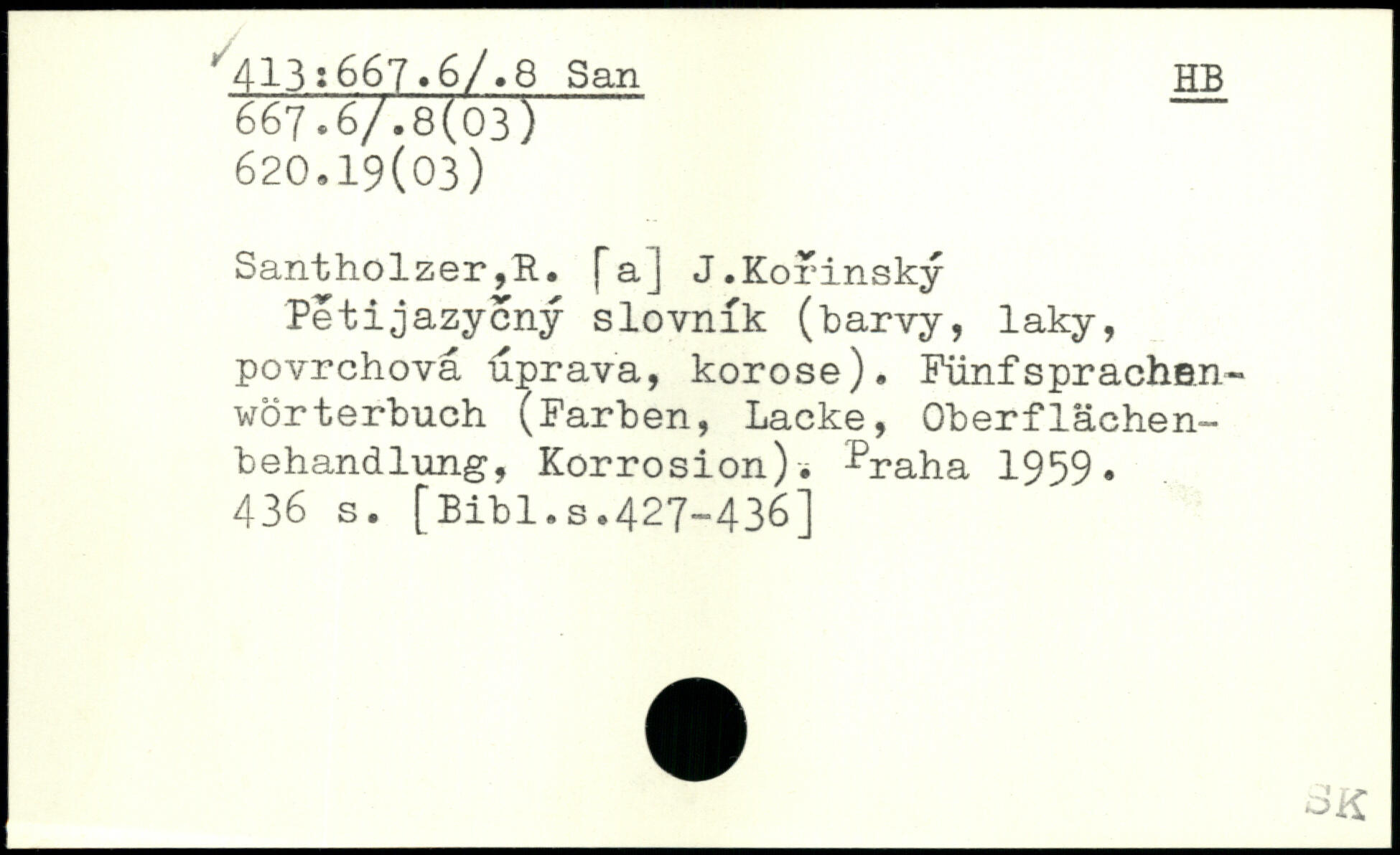 Santholzer,R. [a] J.Korinsky Petijazycny slovnfk (barvy, laky, povrchova. uprava, korose). Fünfsprachen-Wörterbuch (Farben, Lacke, Oberflächenbehandlung, Korrosion). praha 1959.