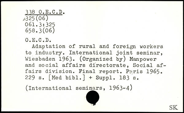O.E.G.D. Adaptation of rural and foreign workers to industry. International joint seminar, Wiesbaden 1963. (Organized by) Manpower and social affairs directorate, Social affairs division. Final report. P;aris 1965.
